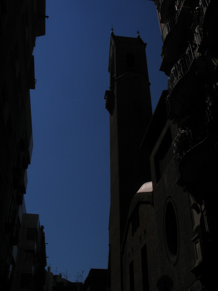 Nighttime? Daytime! (Just way underexposed.) A sky-churchtower canyon just after leaving the apartment.