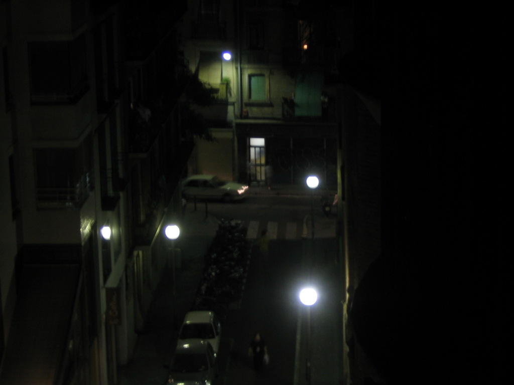 An almost axonometric night view down Bisbe Laguarda from the front balcony.