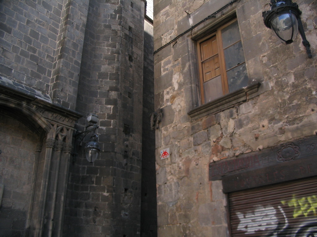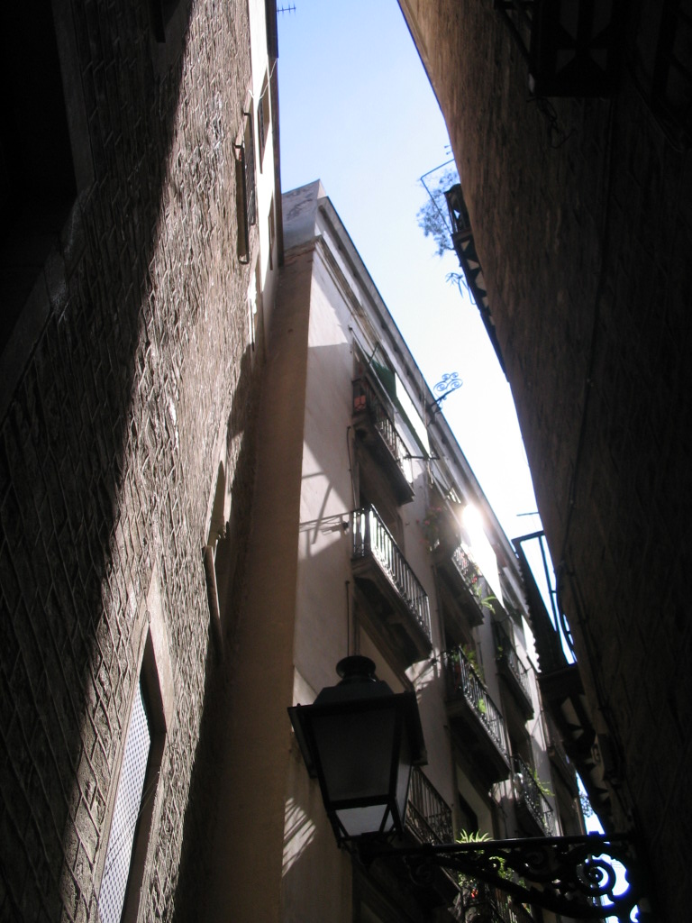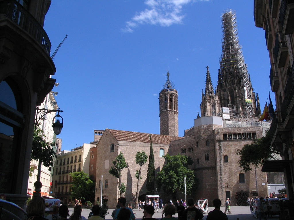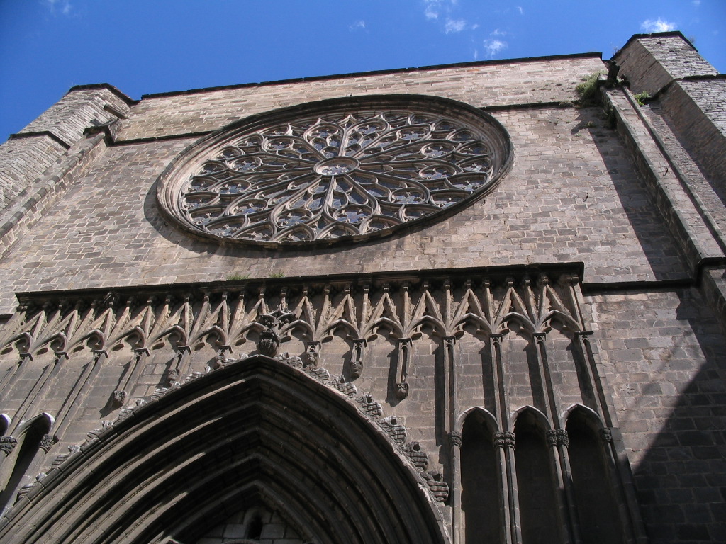 The northwestern façade of Santa Maria del Pi in the high western sun.
