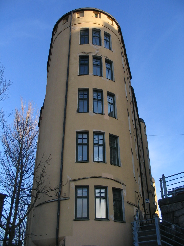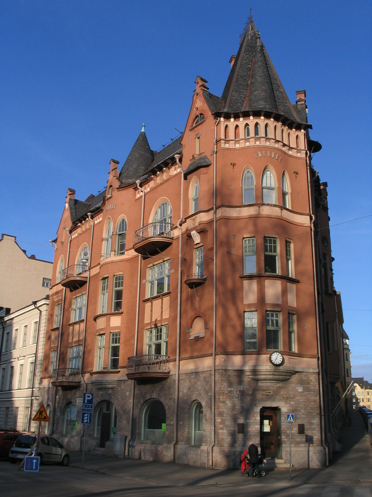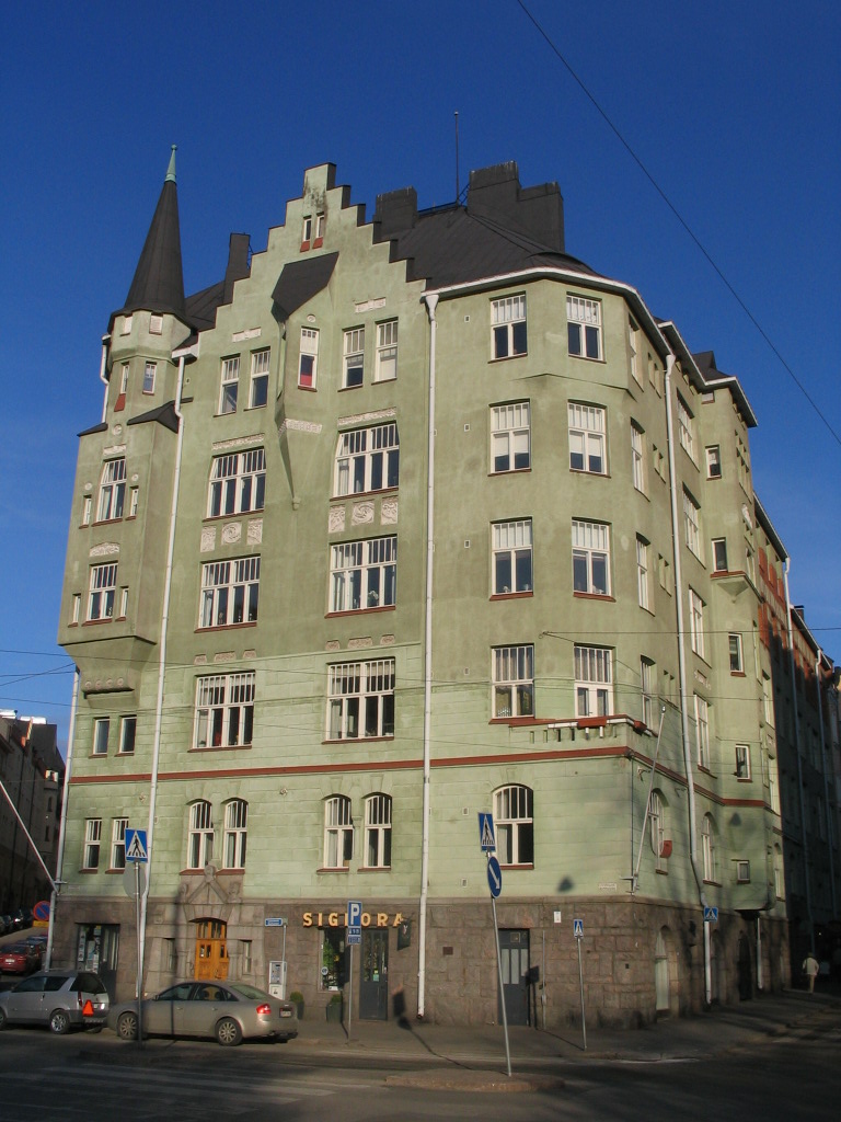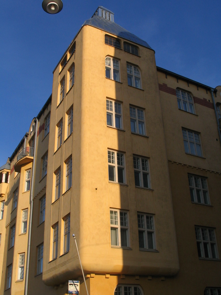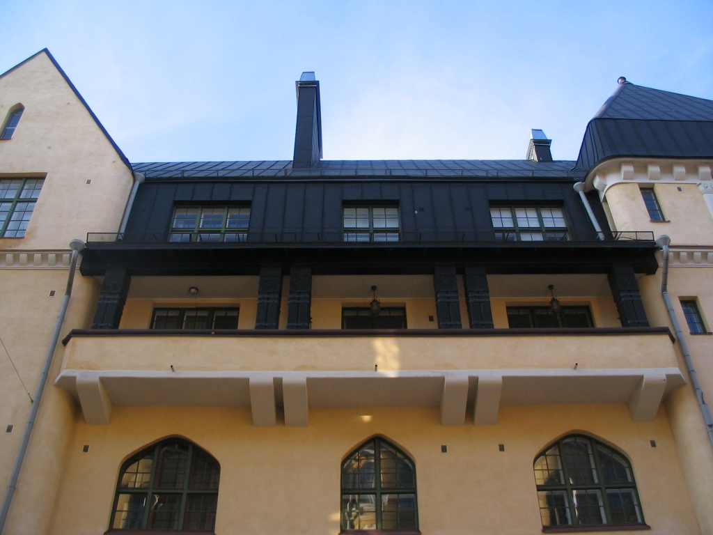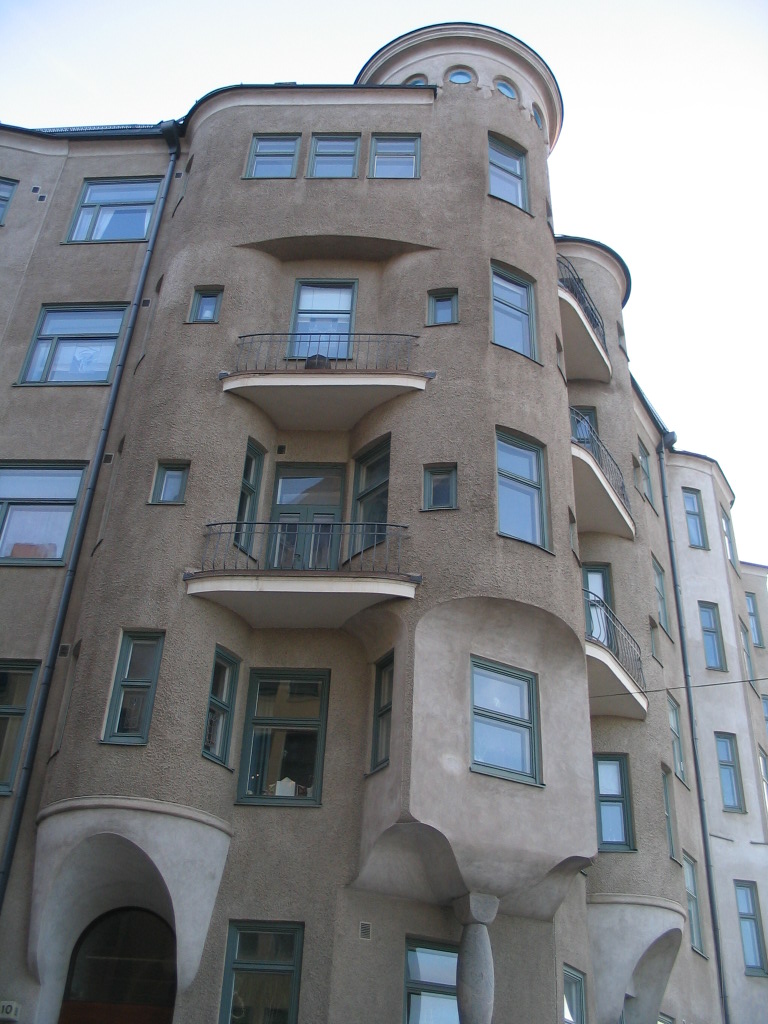 The name of this building is Eol; it was also designed by Gesellius-Lindgren-Saarinen. That balcony is impressively beefy.