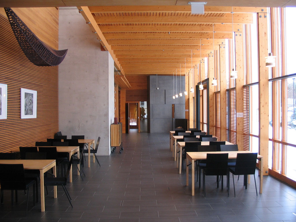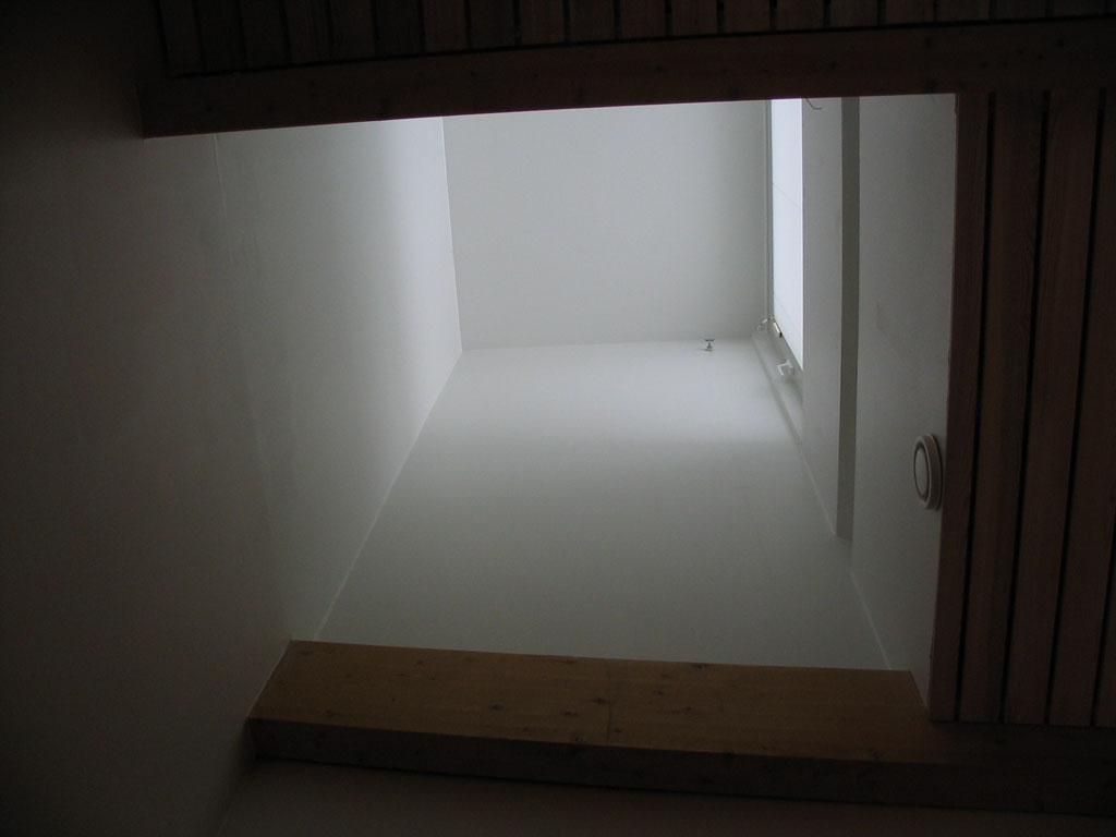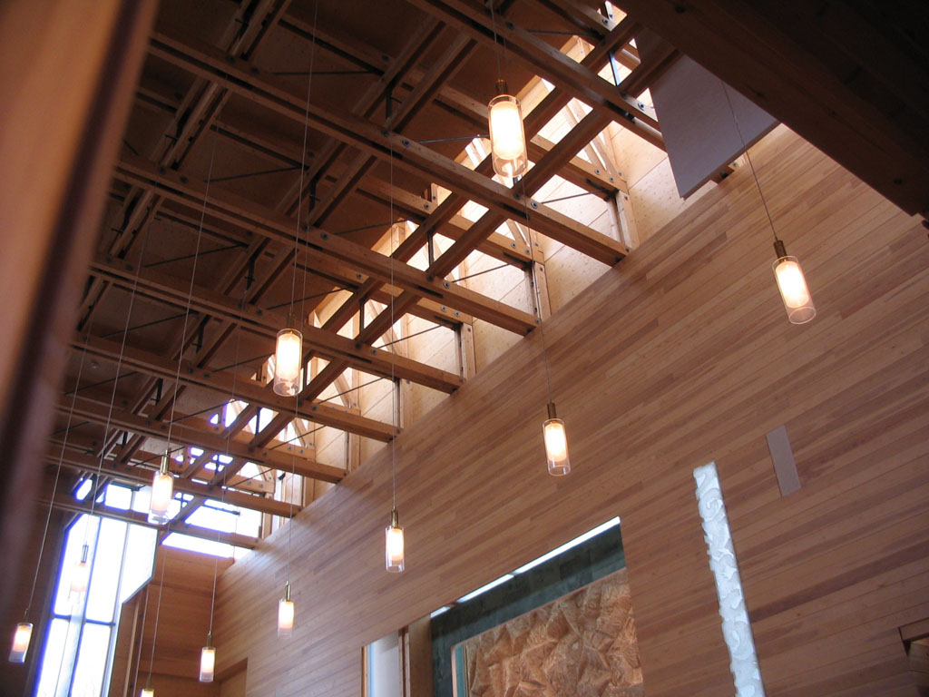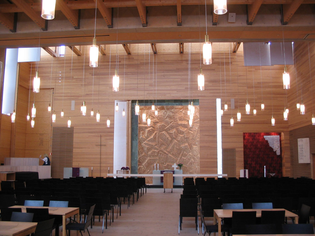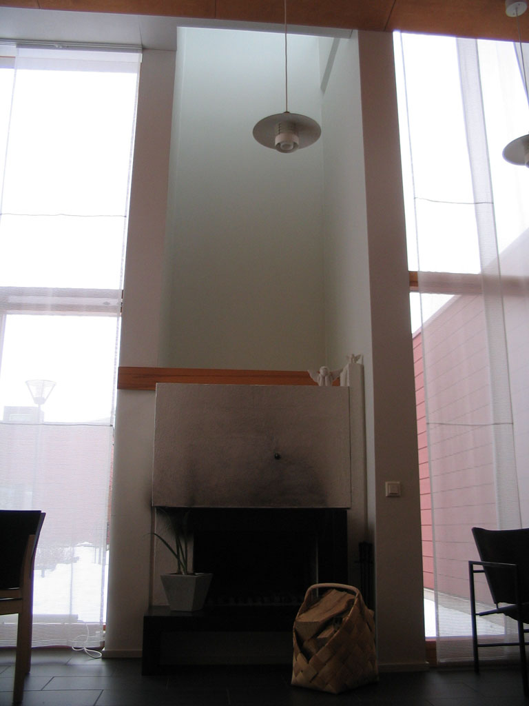 Daylight is used is all kinds of neat ways, as is a Nordic architectural wont; for example, the skylight hidden above this hearth. It would have been nice to see the church on a sunny day, but the degree to which the wood warmed up the light inside was quite nice nonetheless.