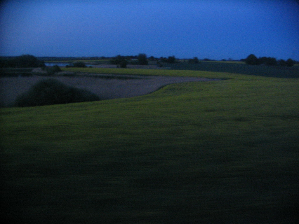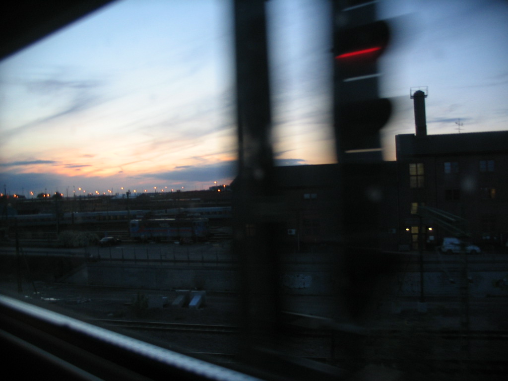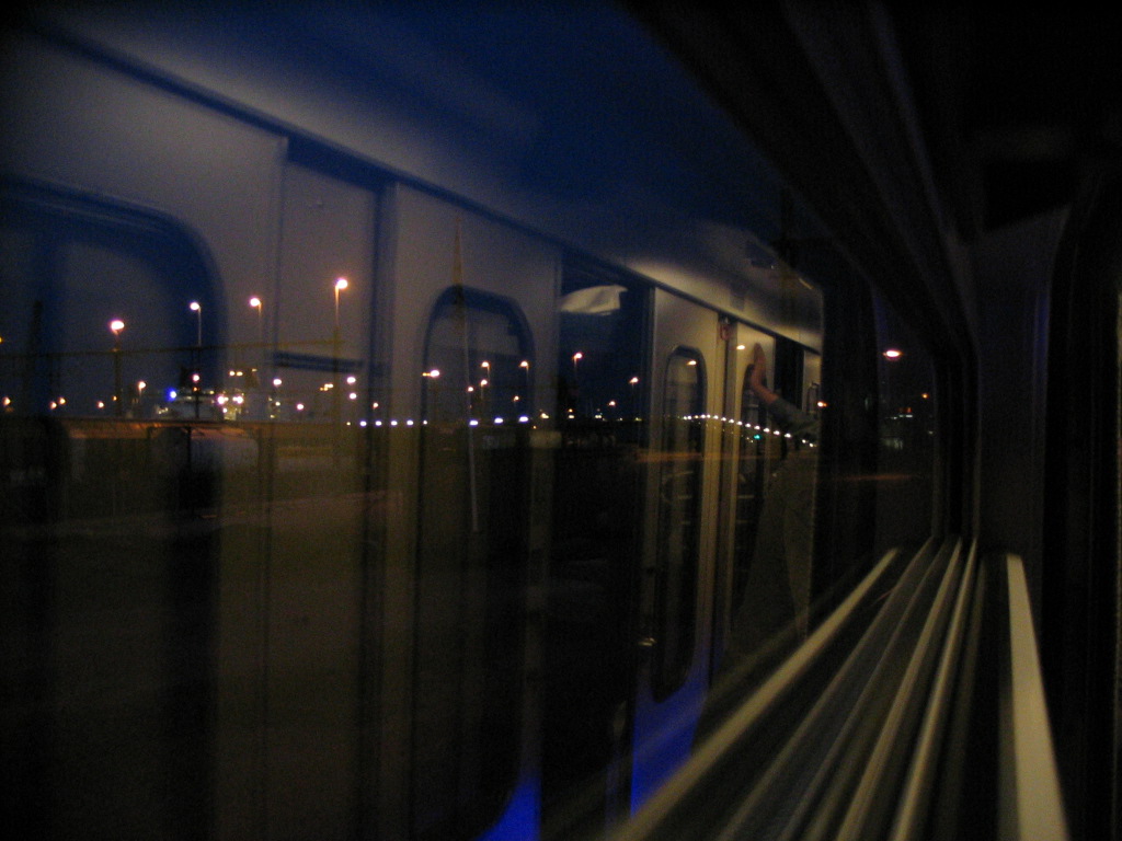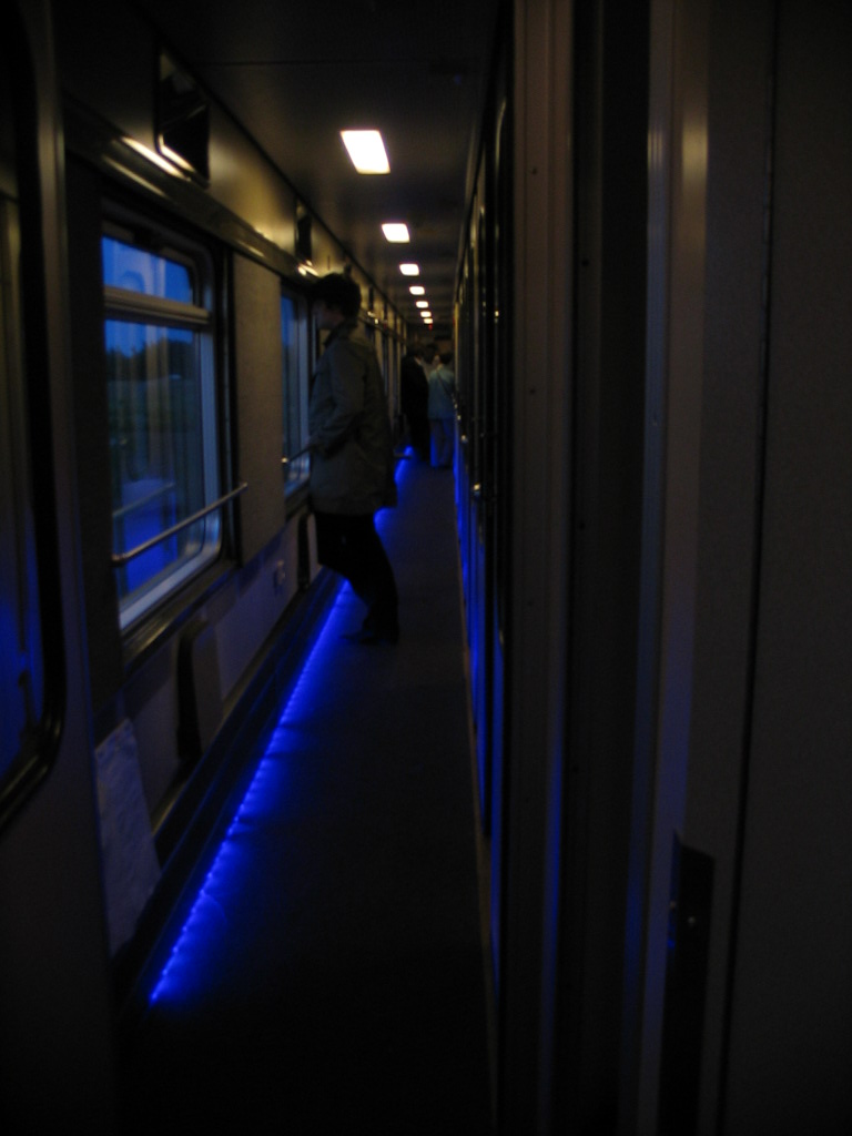 The club-blue lighting of the train floor nearly equalled the color of the evening light outside.