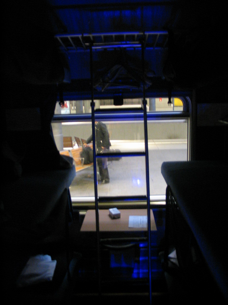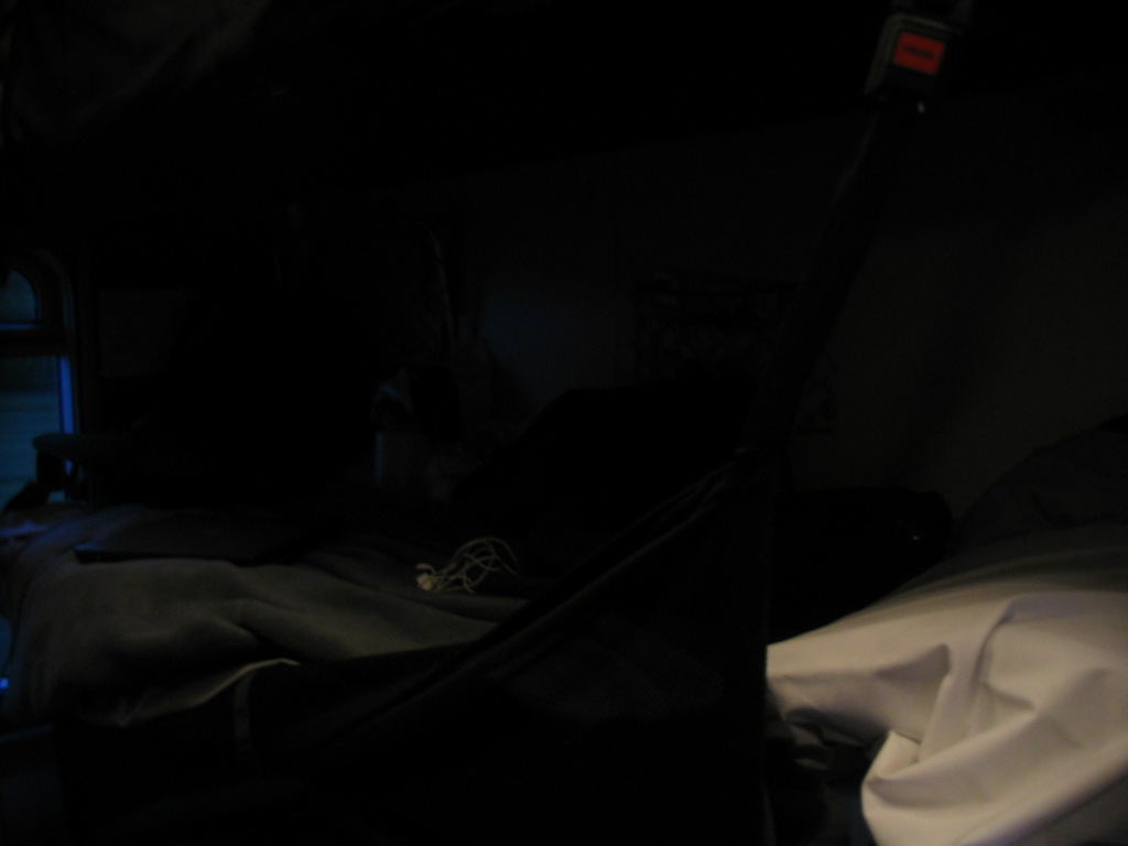 My top-bunk bed on the train, with a reassuring set of straps and flaps to prevent rolling out.
