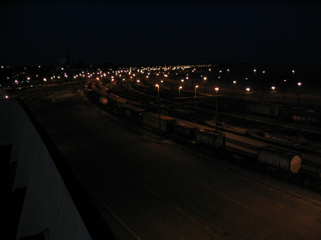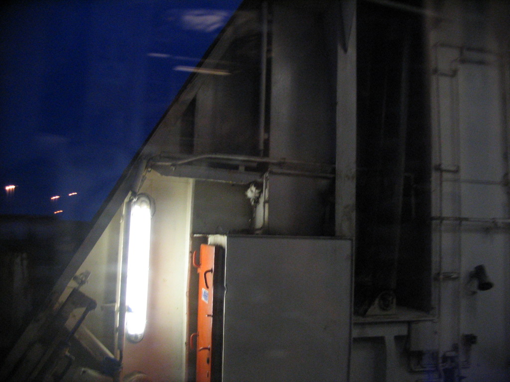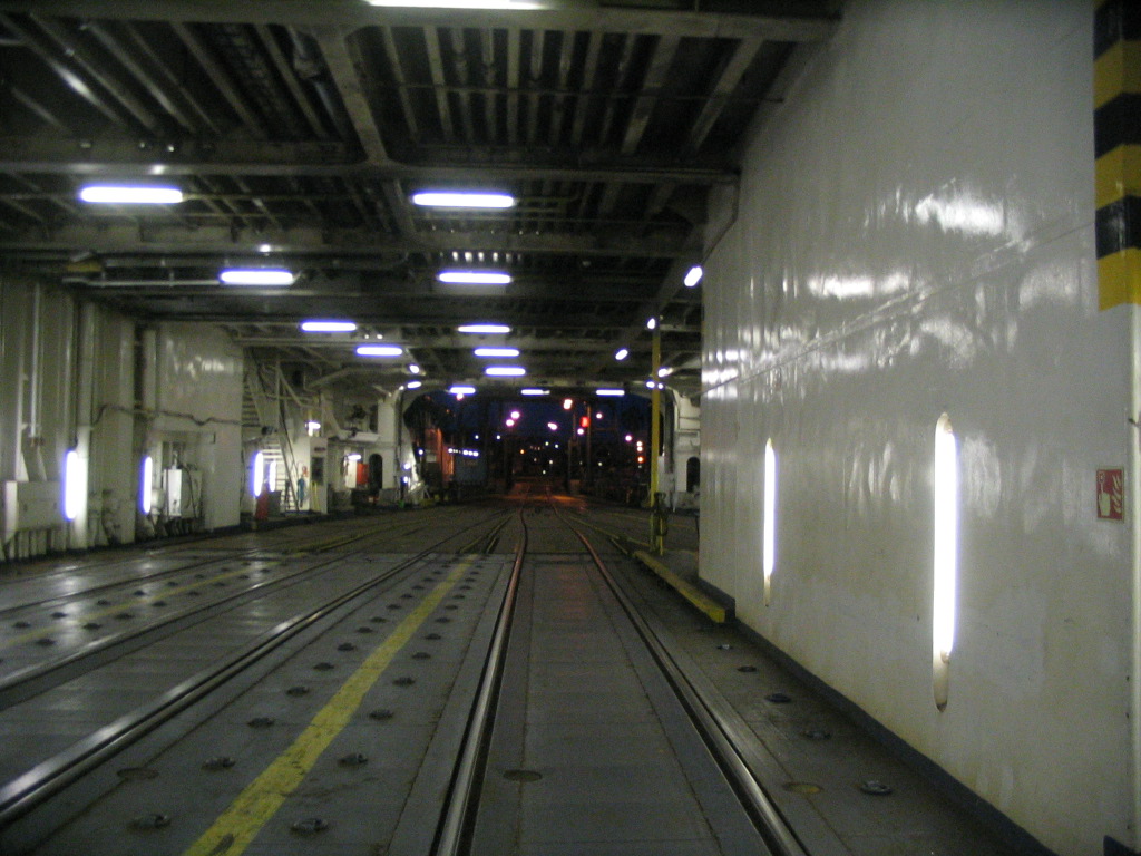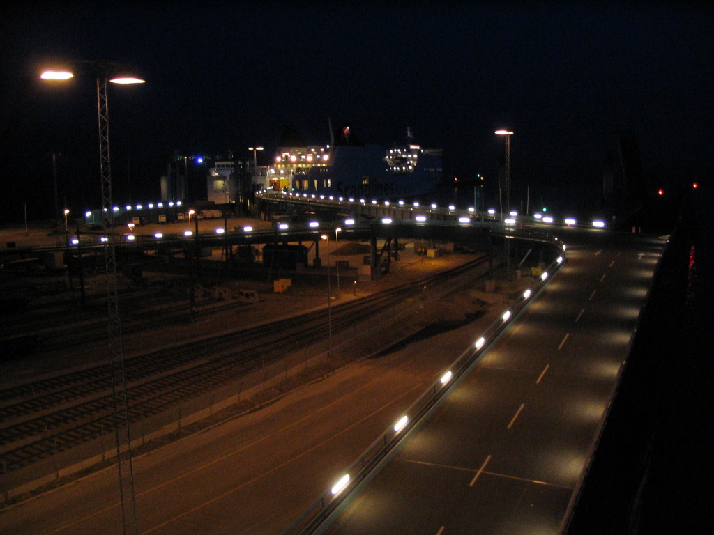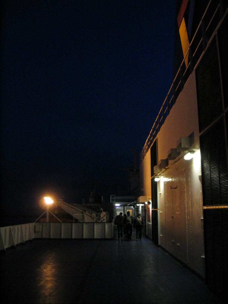 So I went up on deck and checked out the views; here, some runway-like lanes outside at the port, seemingly for boarding car ferries (note the ferry in the background at the end of the runway).