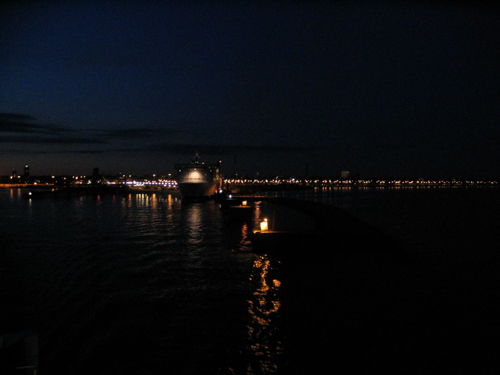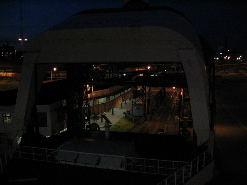 This series of apparent drums with overhead lights receding up to the other ship is inscrutable in this photo; maybe they're the ends of jetties or docks?