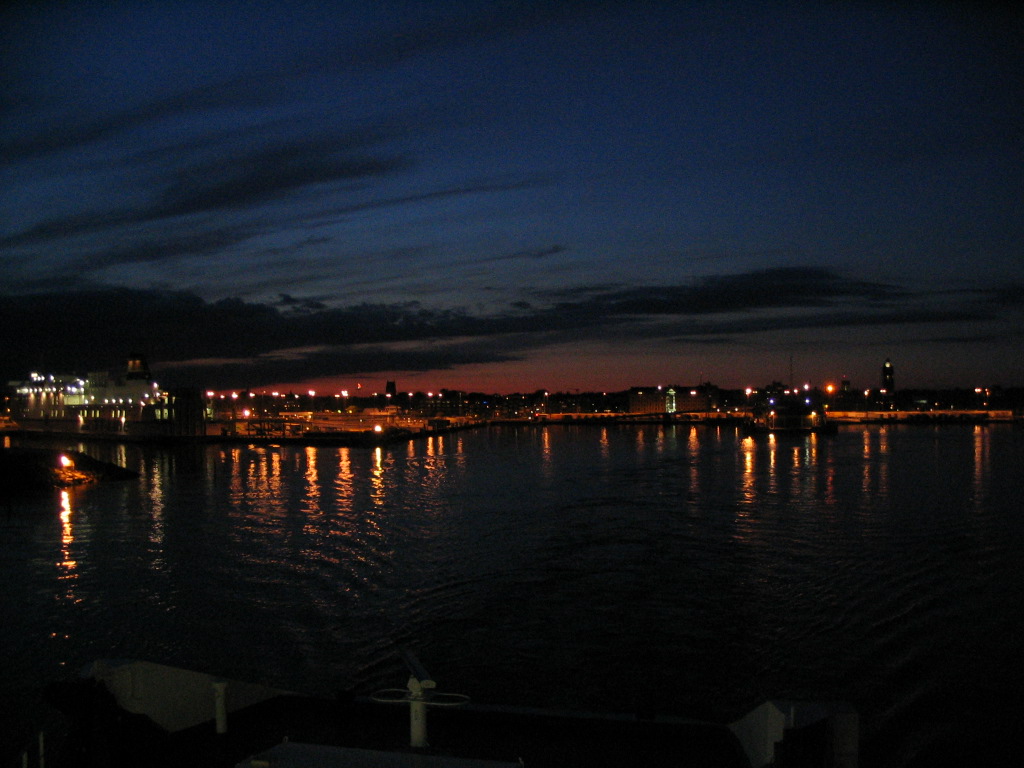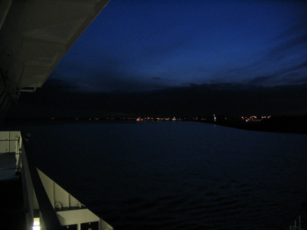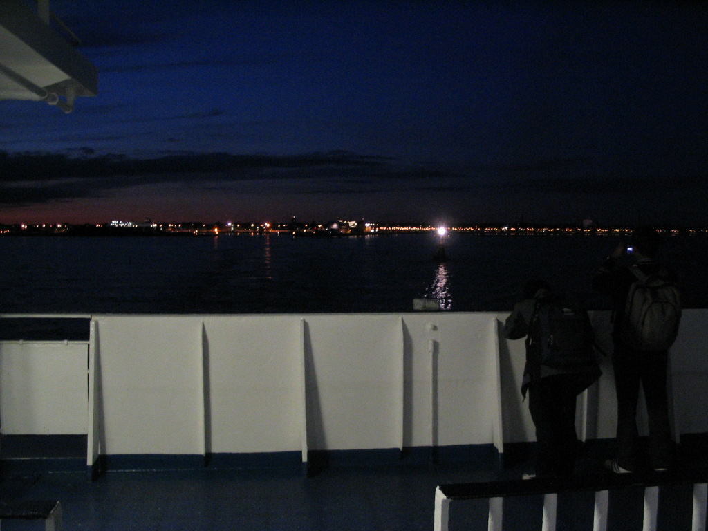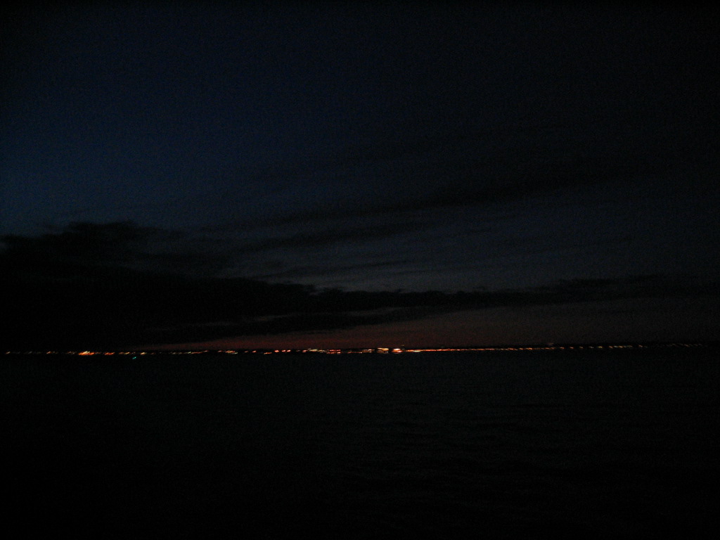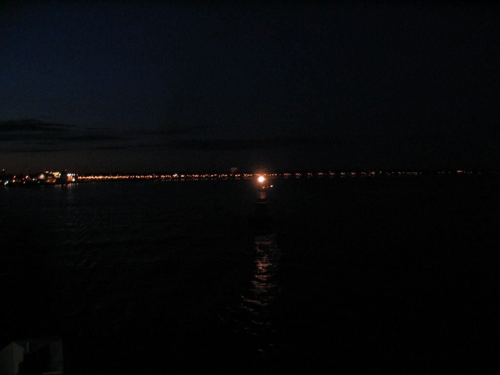 After we pushed off from shore, this lovely remaining bit of twilight color offered a counterpoint to the electric lights reflecting on the water.