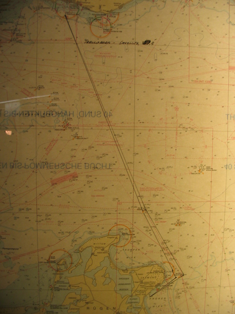 A map on display showing the connection, from Trelleborg at the north end to Sässnitz at the south, on the large German island Rügen.
