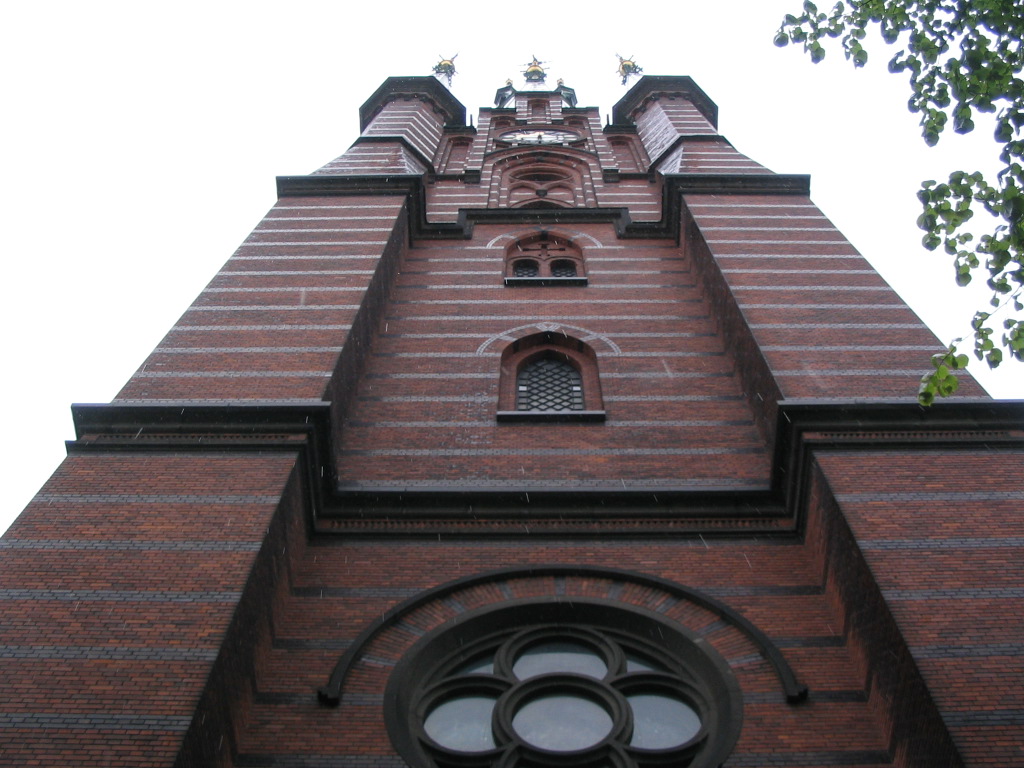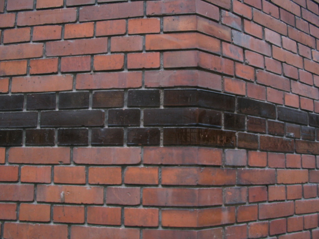 A closeup on one of the church's distinctive brick bands, contrasting in both color and gloss.