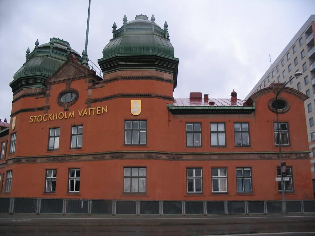 Across the bridge (the short way, i.e. like across the street): Stockholm Vatten, the Stockholm waterworks. Stockholm colorists seem to love ruddy oranges.