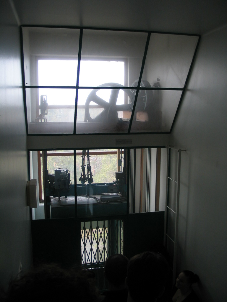 A cool old elevator with a view outside.
