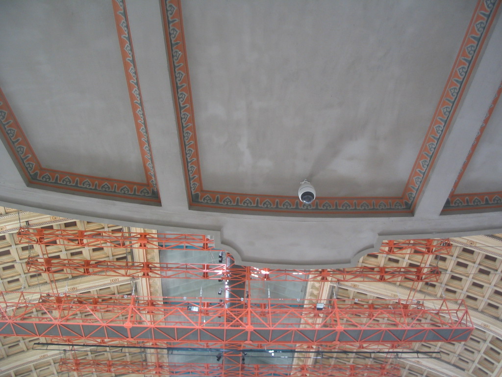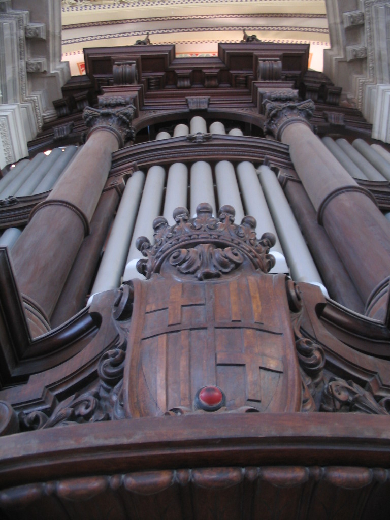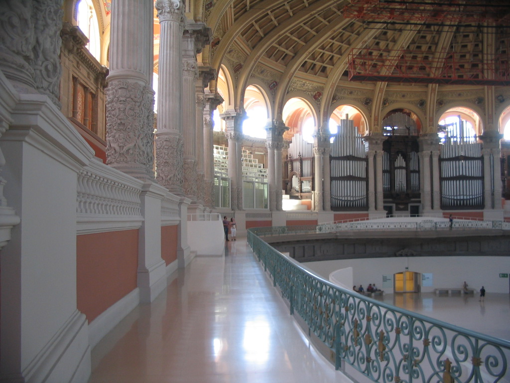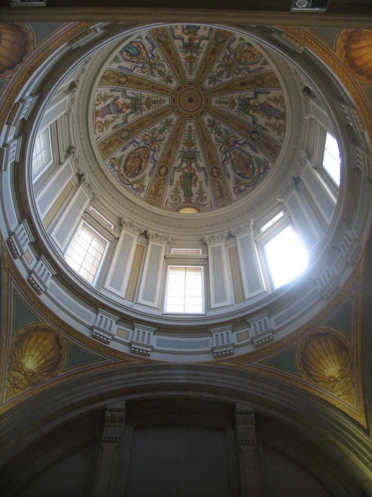 The underside of the balcony by the organ in the Great Hall, rather calmer than the coffered dome beyond.