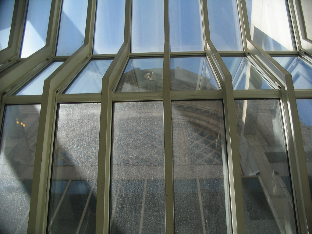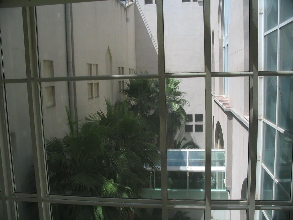 An inviting but seemingly inaccessible lightwell, sprinkled with that quintessial pomo signifier, the 2x2 square window.