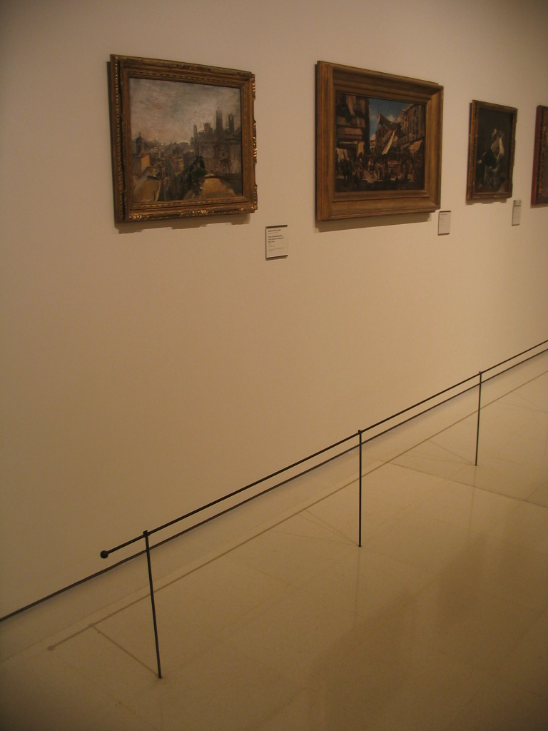 This guardrail is very elegant in its simplicity. Note that while the posts have multiple shadows, the main rail appears to have a single, darker shadow, presumably because the lights washing the wall are in line parallel to the rail.