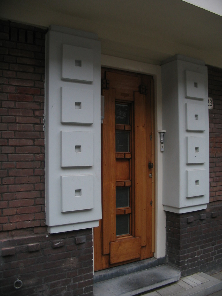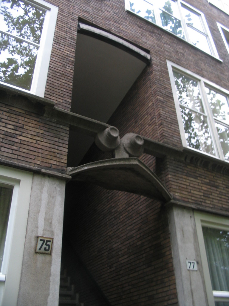 Further along between Bachstraat and Beethovenstraat, one of the most curious entry details in all of Plan Zuid, evoking a bug-eyed beaked creature.
