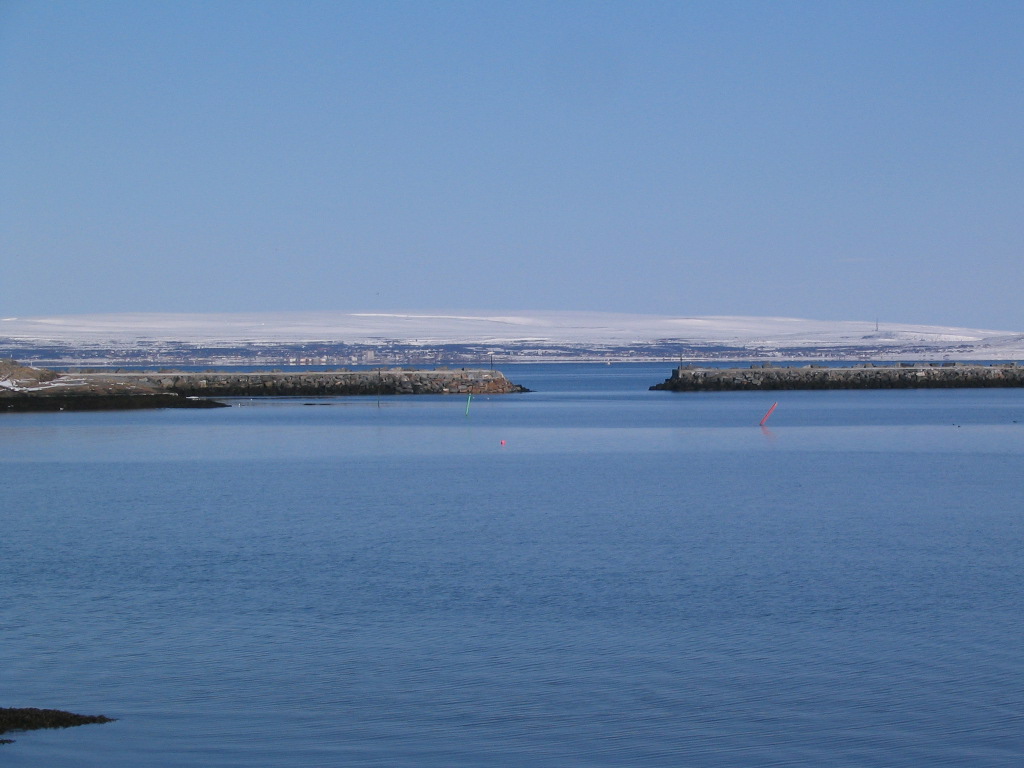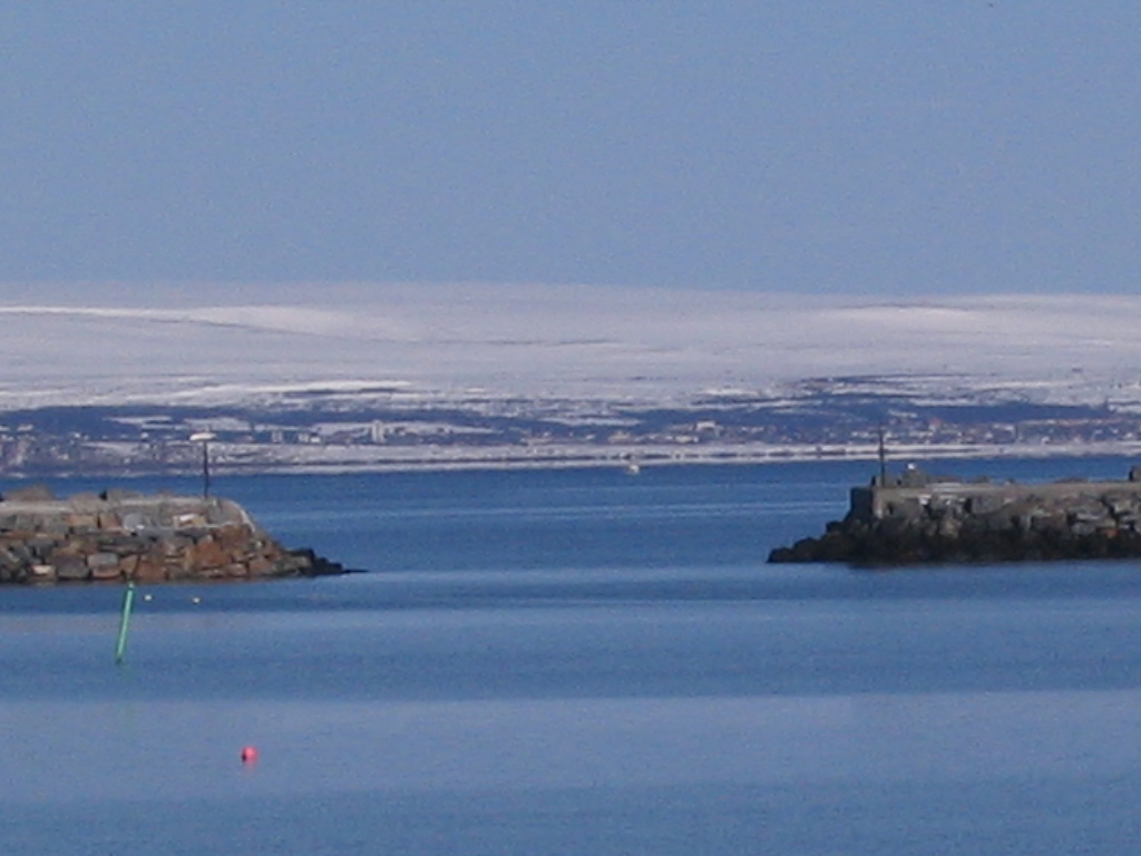 The harbor jetties and Vadsø beyond, and a glacier beyond that.