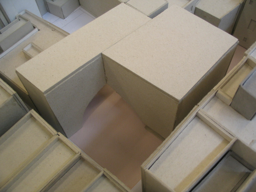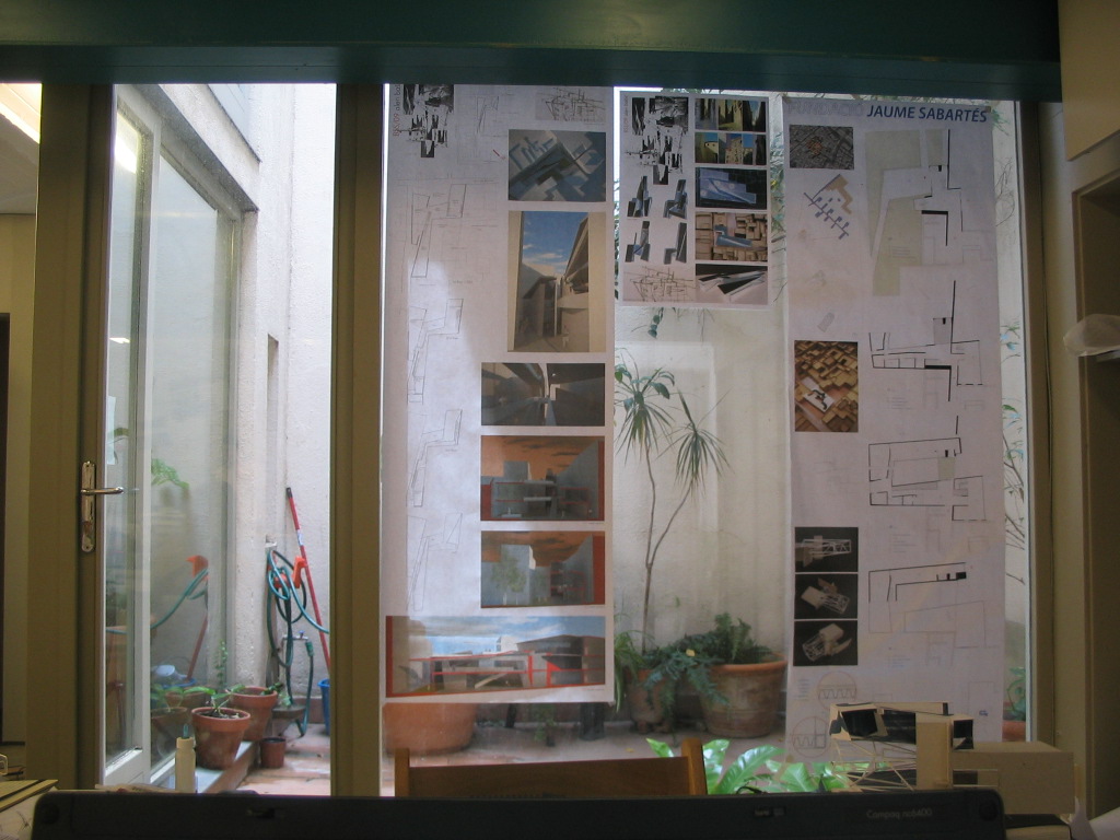 In studio, project boards hanging on the wall of one of the adjacent lightwells.