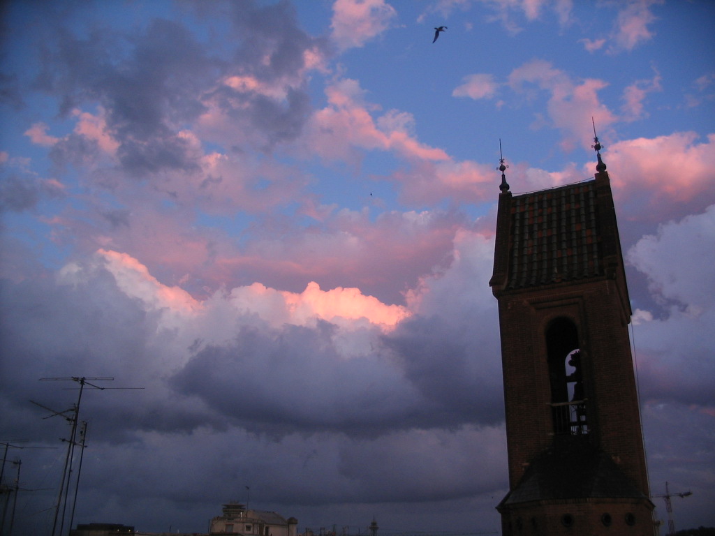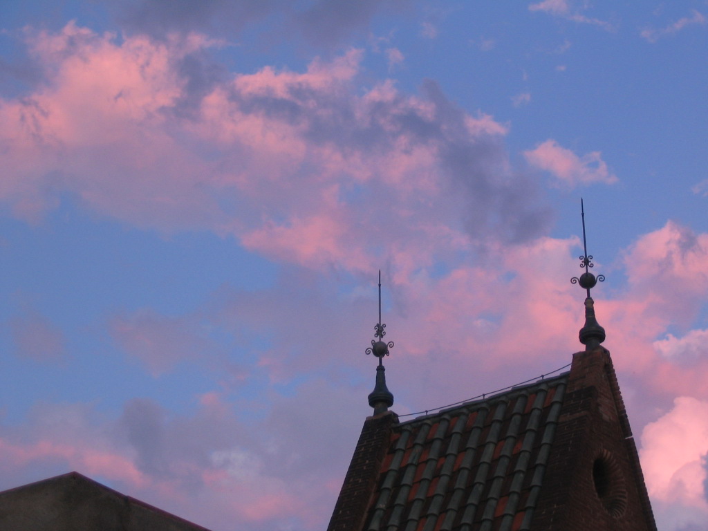 Pink sun on higher clouds over the church spire. I also like the mix of red and green on the spire's roof tiles, which I'd forgotten about or maybe not noticed before.