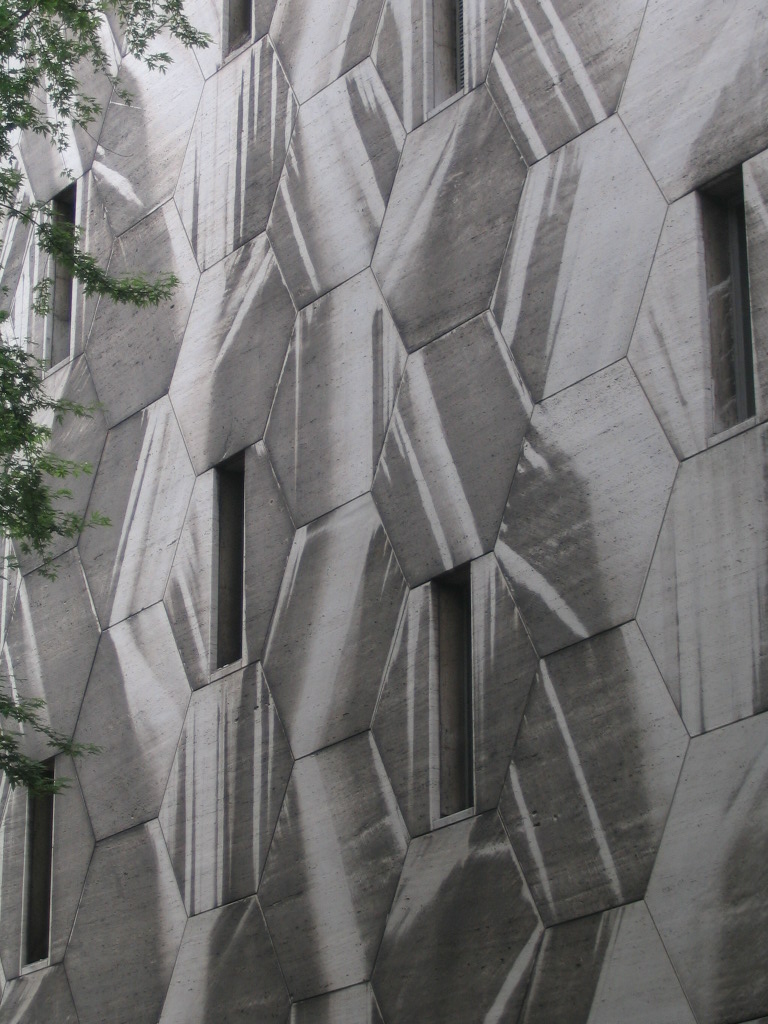 This wall of hexagons that appear to have been sliced out of the original Doctor Who title sequence is the wall of Rotterdam's De Bijenkorf store, the current version designed by Marcel Breuer after the original one was destroyed in the war. I have not yet figured out why the stones have those striations. If you know why, holla at me!