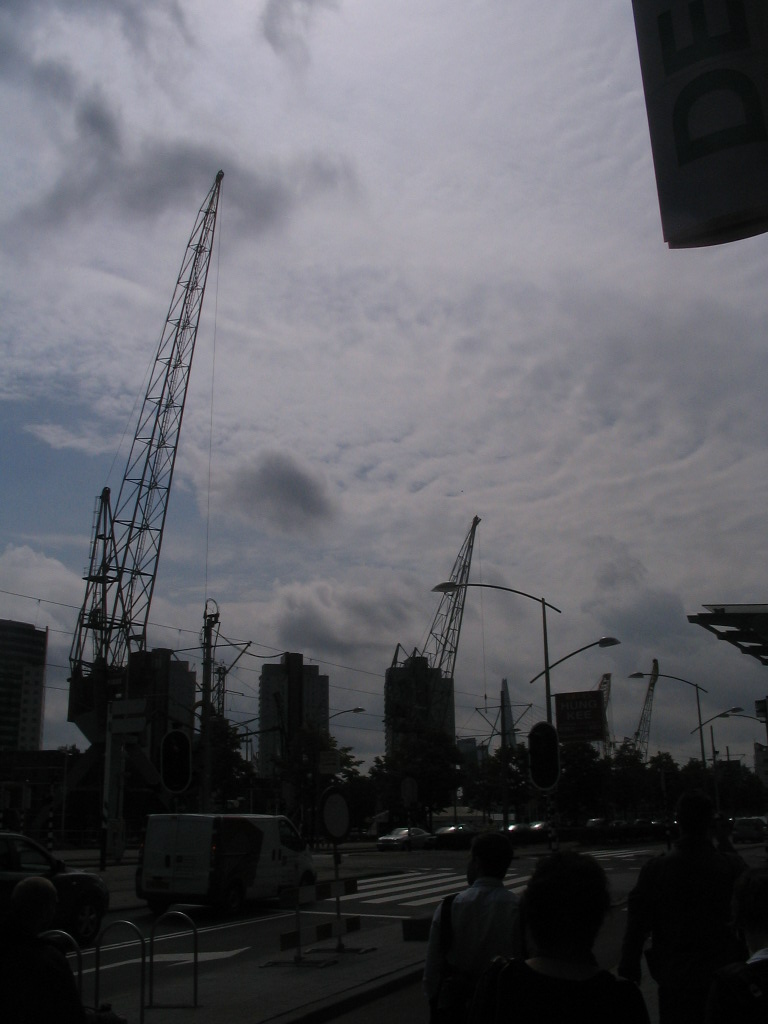 By continuing along Schiedamsedijk, the continuation of Coolsingel, we ended up down by the Nieuwe Maas (New Meuse), the waterway that forms the backbone of the city, where ship cranes loomed. Note that the Nieuwe Maas is actually mostly a distributary of the Rhine rather than the Meuse!