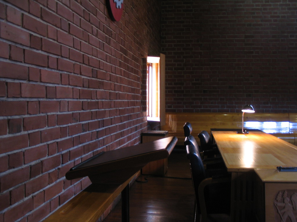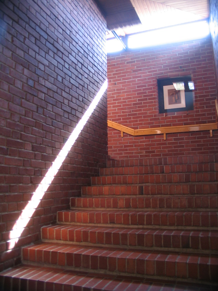 Looking up the stairs to the assembly hall, which wrap around the hall as they ascend.