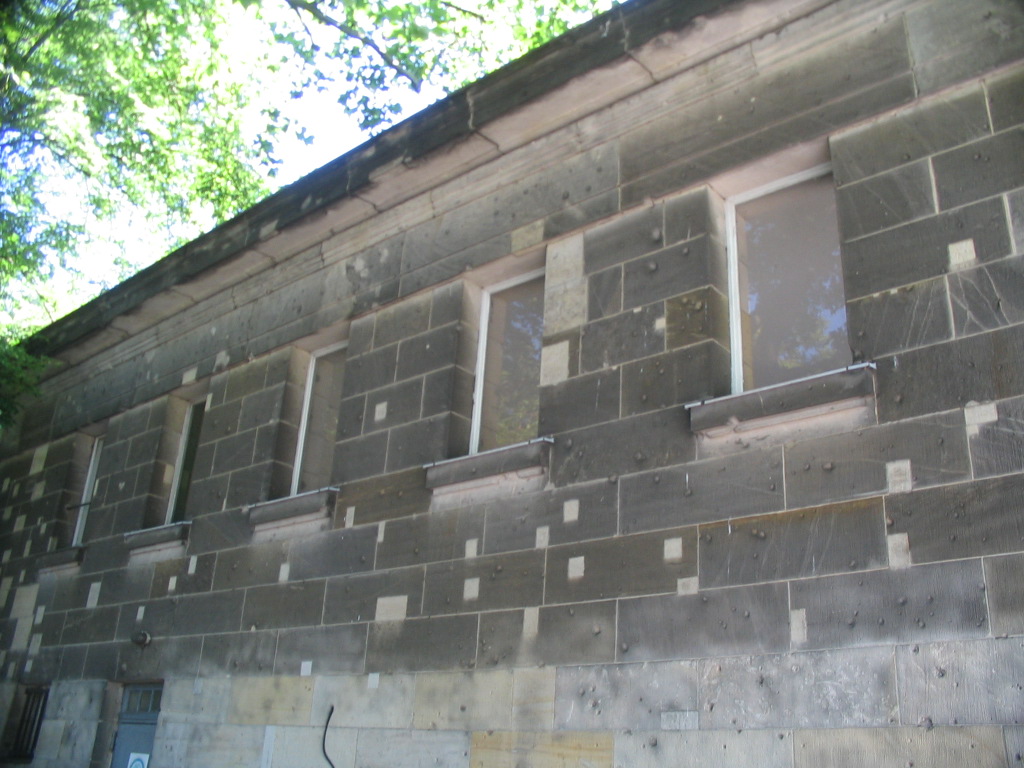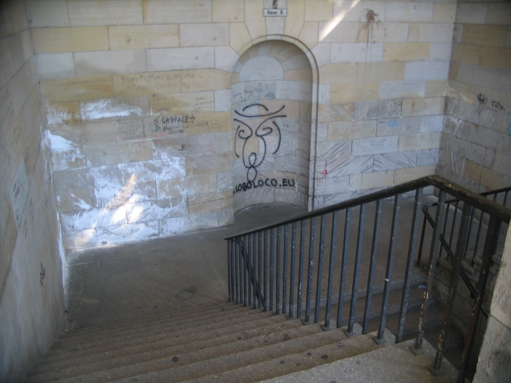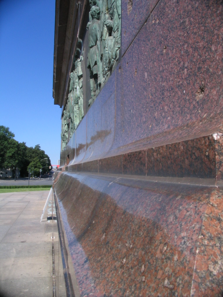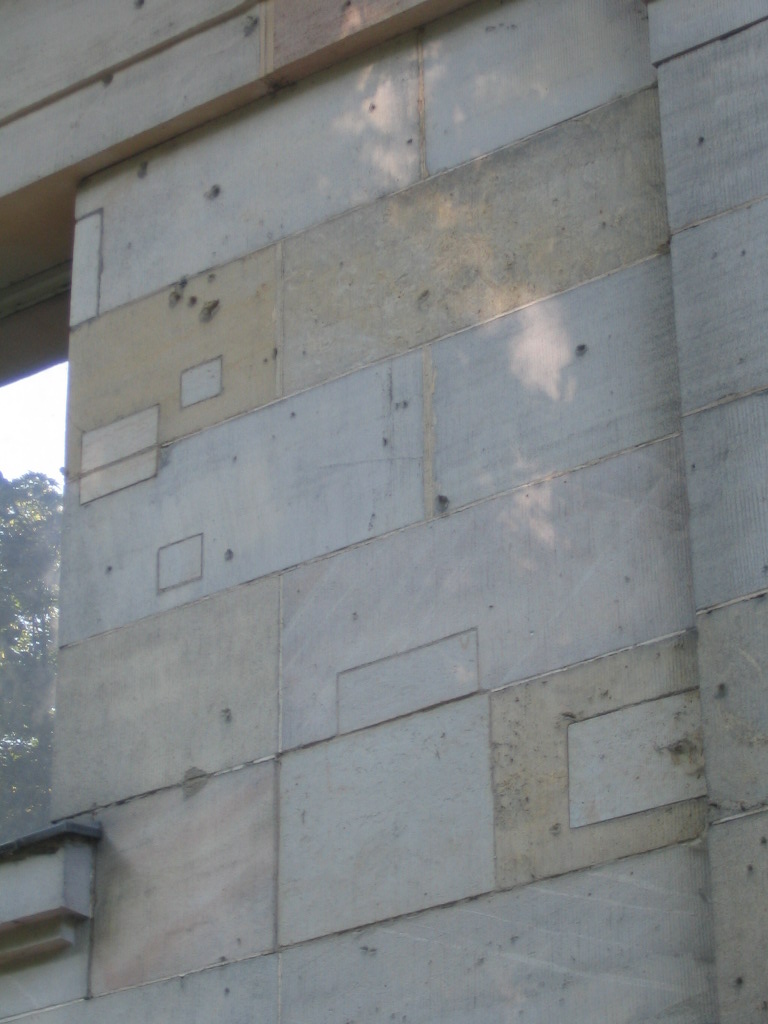 There are underground tunnels leading from head houses around the Großer Stern to the Siegessäule, in order to separate pedestrian access to the monument from the multiple-lane rotary traffic. This is a wall detail from one of the head houses, with these curious patches in the stone.
