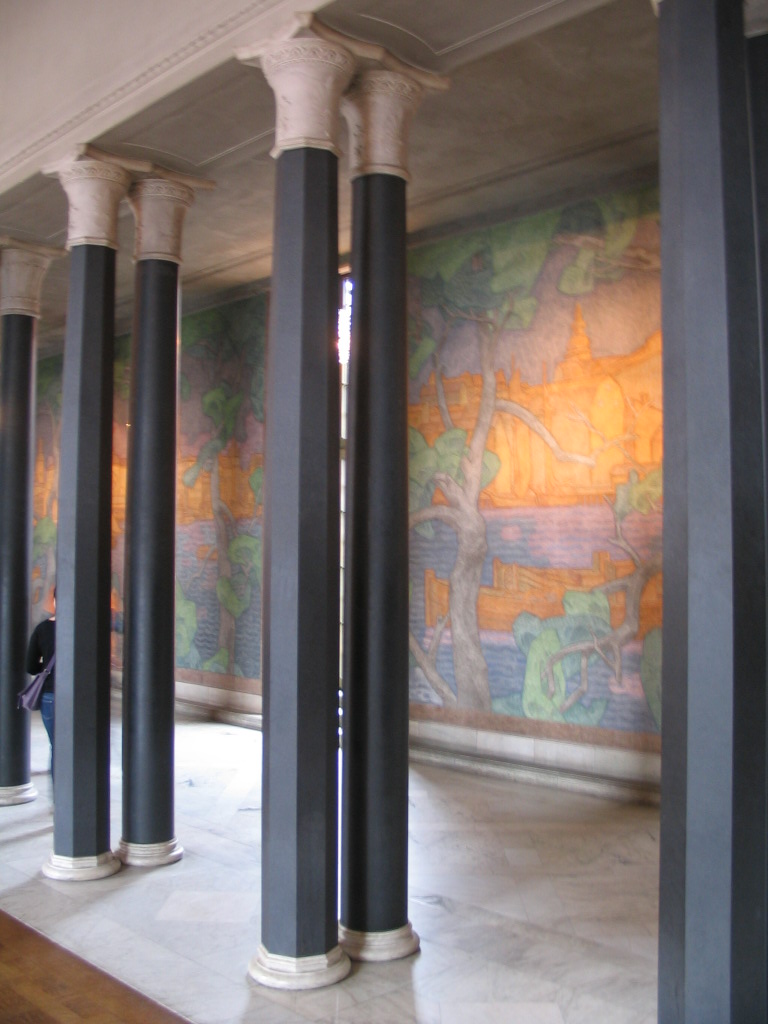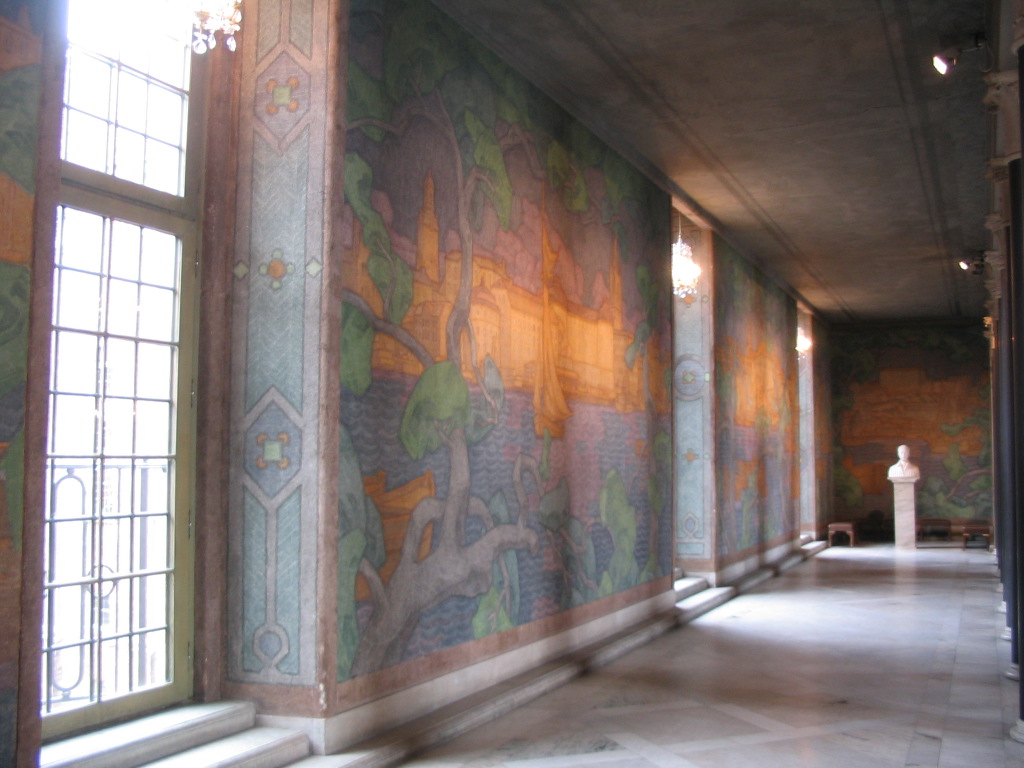 Another hall, on the south side, with a mirror-image mural of the scene right outside the windows.
