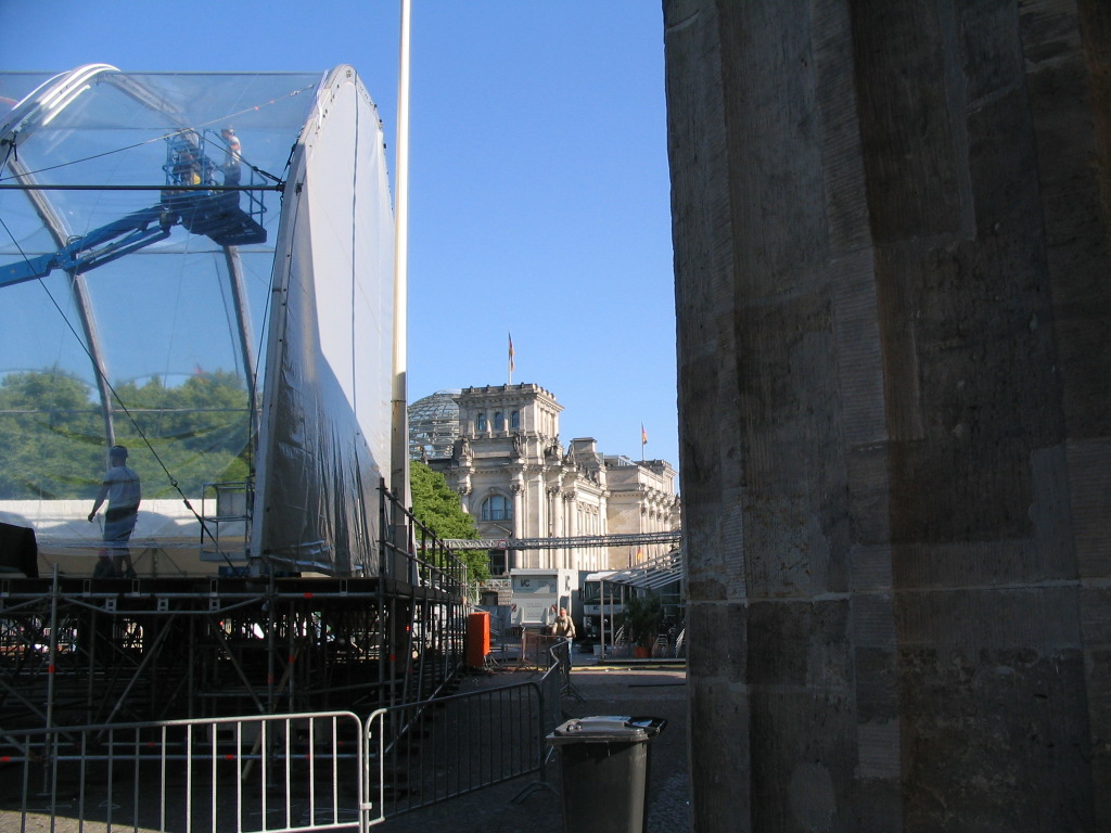 A glimpse past the Tor's palimpsestuous columns back north to the Reichstag. There was some kind of Event being set up for right there as well.