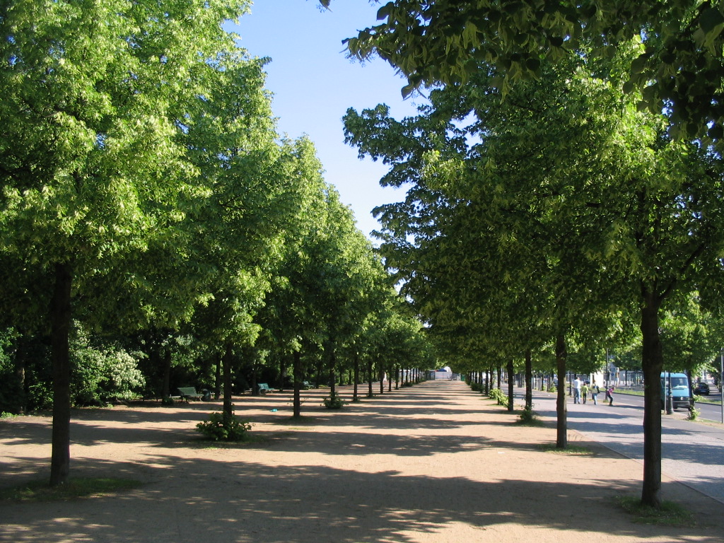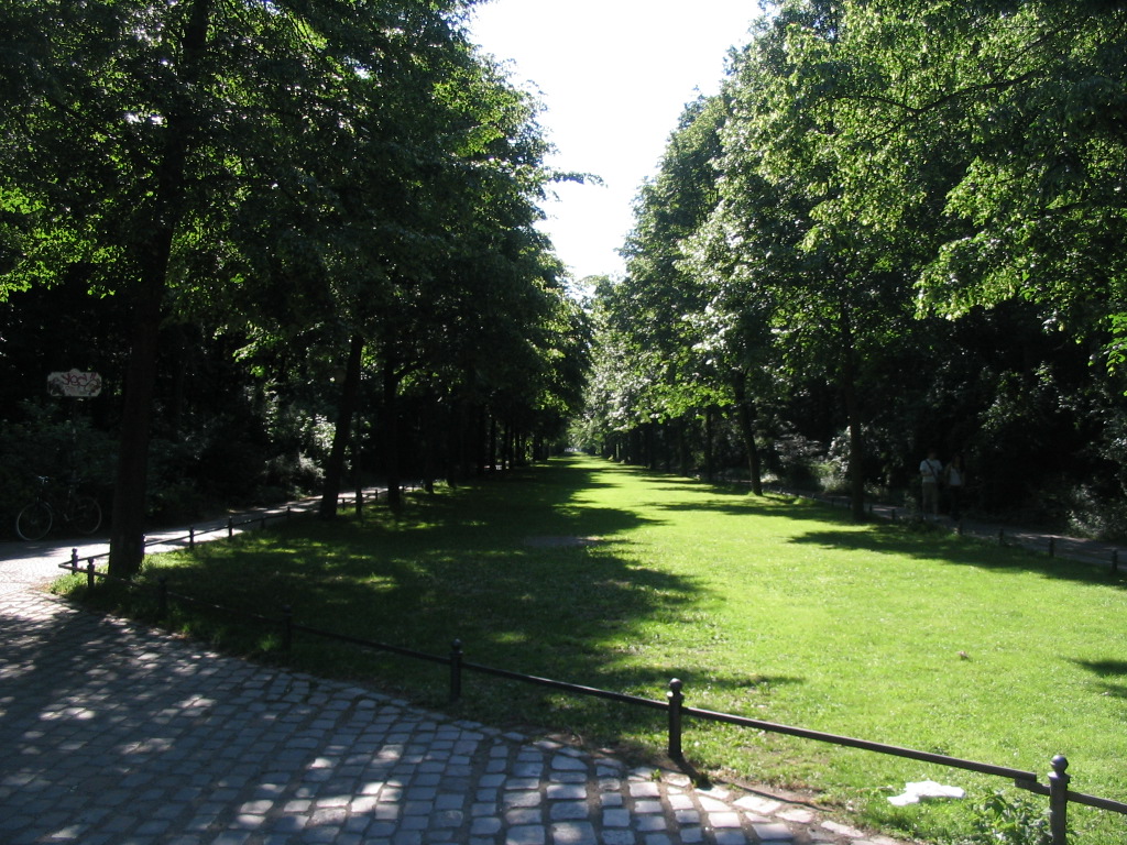 I was walking west along the Bremer Weg, a main path paralleling the Straße des 17. Juni. Here it crossed the bucolic Bellevueallee, which recedes toward the southeast. I'm not sure I've seen such a long, narrow grassy stretch before or since; it's rather enchanting.