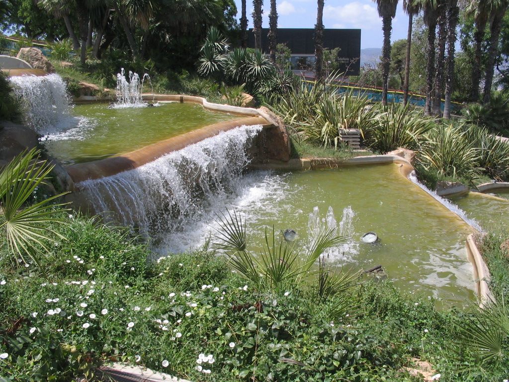 The Mirador comprises multiple plazas stepping up the slope, arrayed around this gentle waterfall.