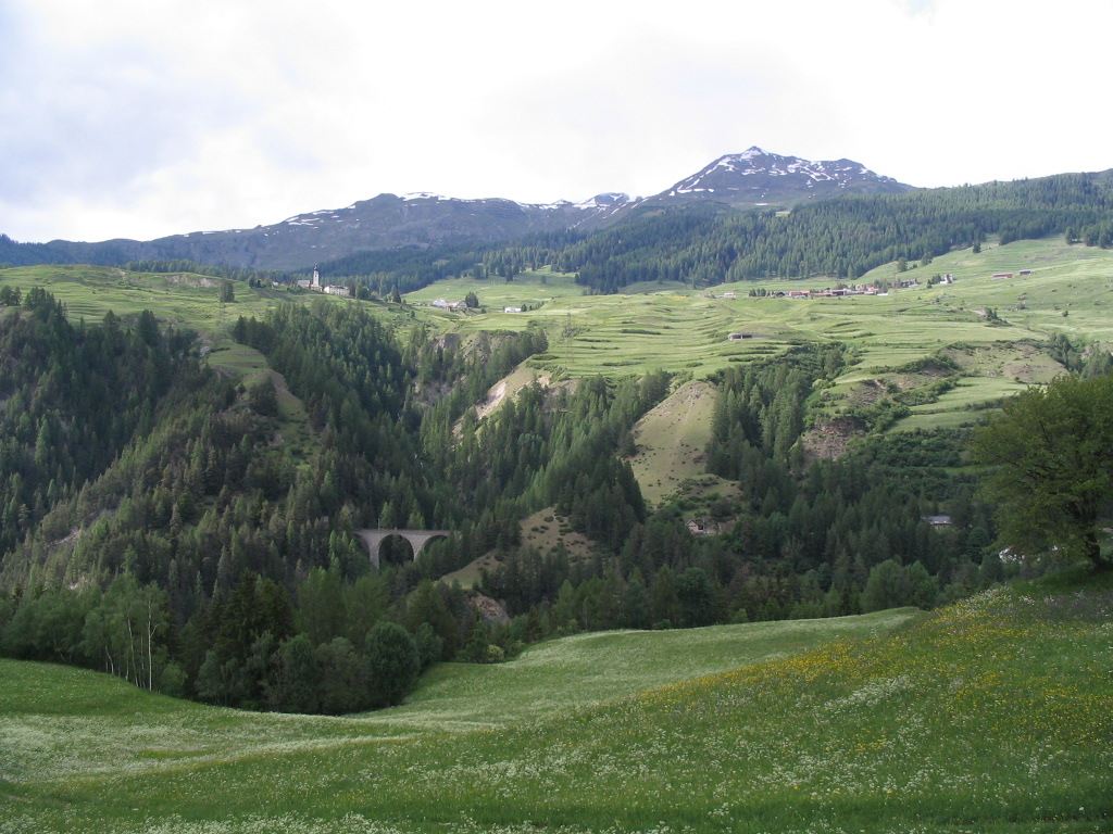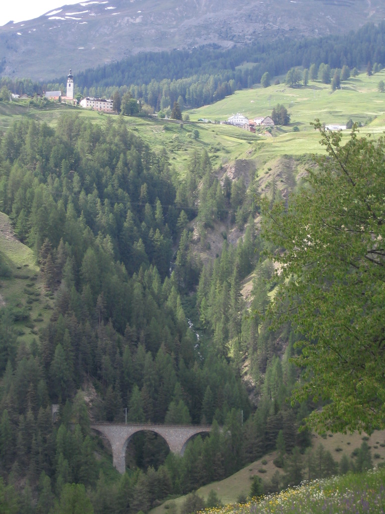A precipitous view of Ftan-Grond, the Aval Val Püzza that drains it, and the railroad bridge over that.