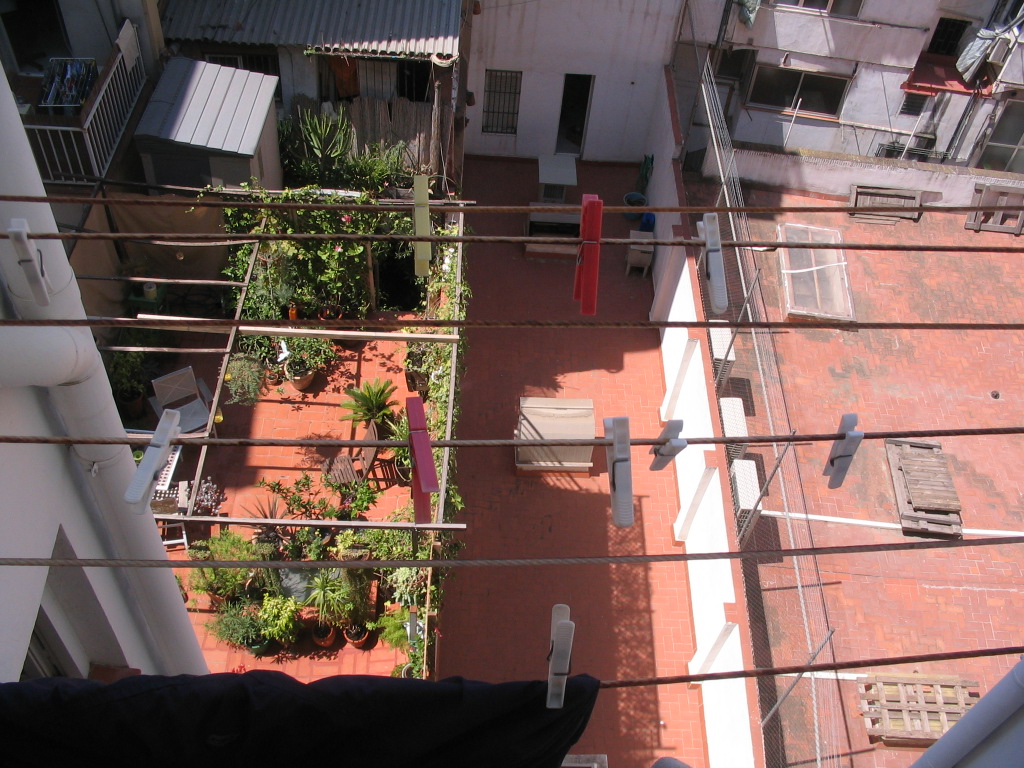 A partly sunny shot of the diverse midblock terraces through the clotheslines just outside the window.