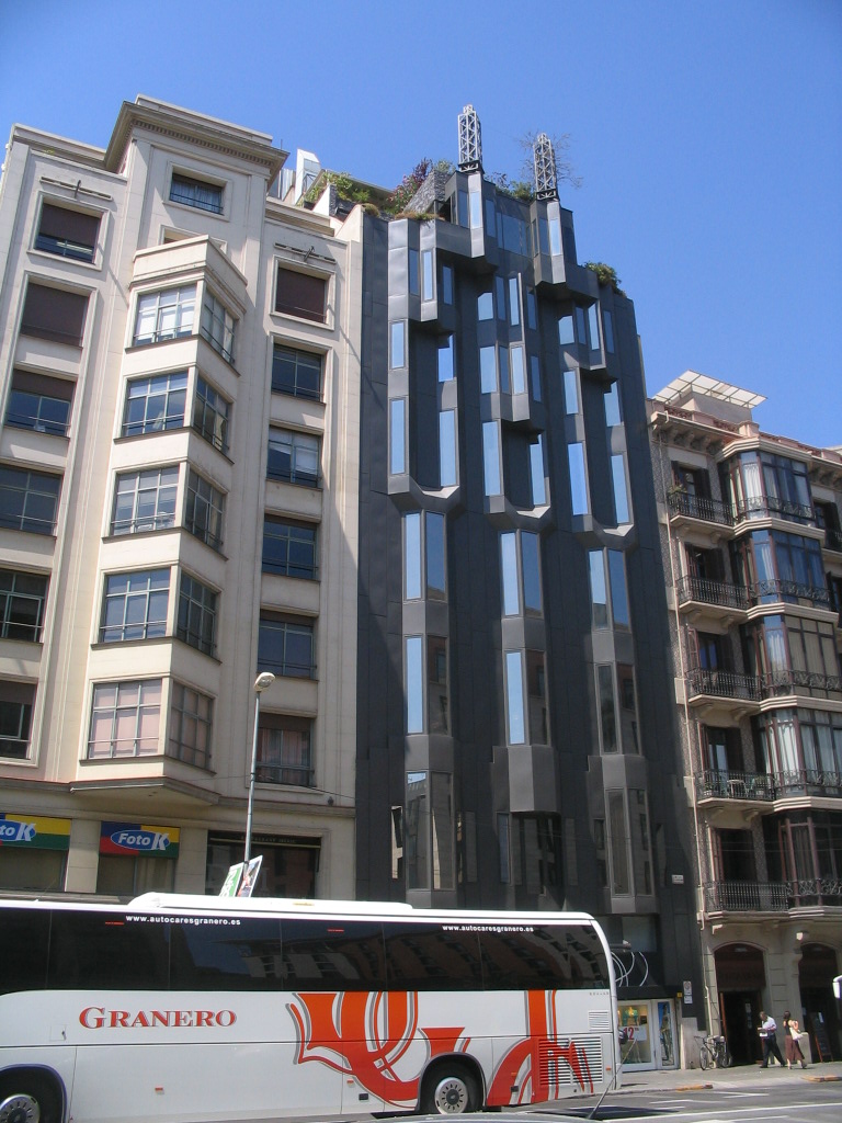 Along Ronda de la Universitat, a very distinctive, and distinctly ominous, façade, except for the incongruously friendly roof greenery.