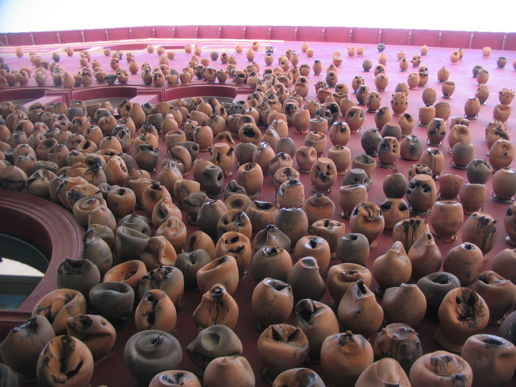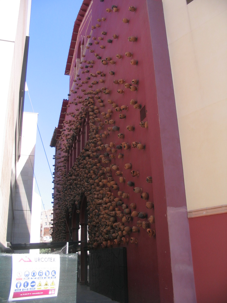 Between the south face of IT and the Teatre is the Passatge Mercat de les Flors, and here the Teatre offers up a heaping spoonful of weird: hundreds of deformed terra cotta pots on a decidedly red wall.