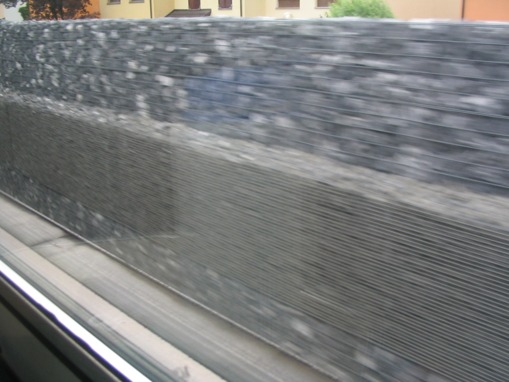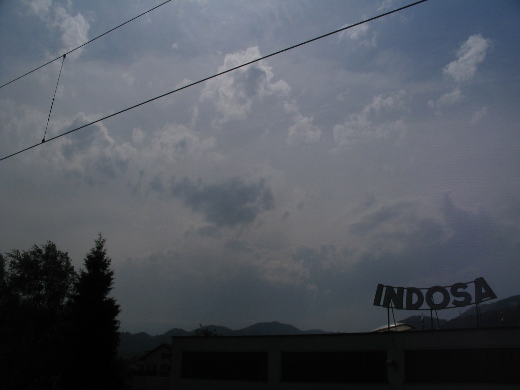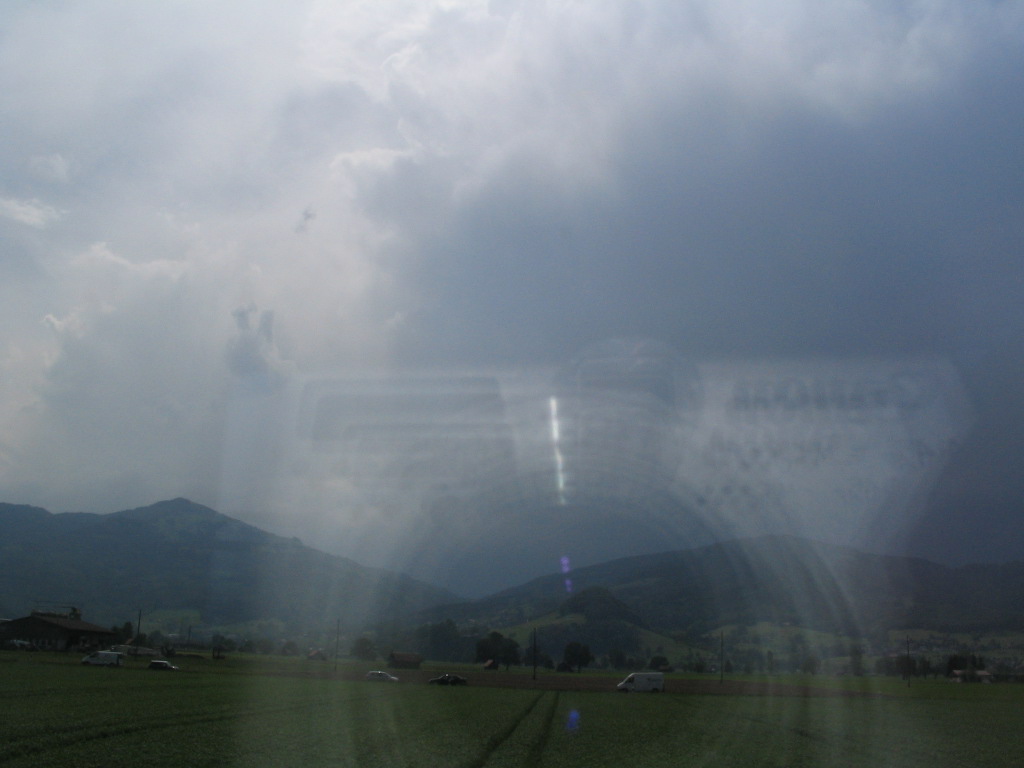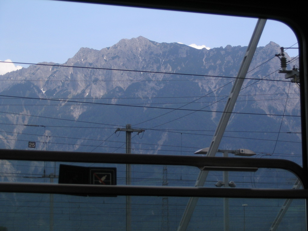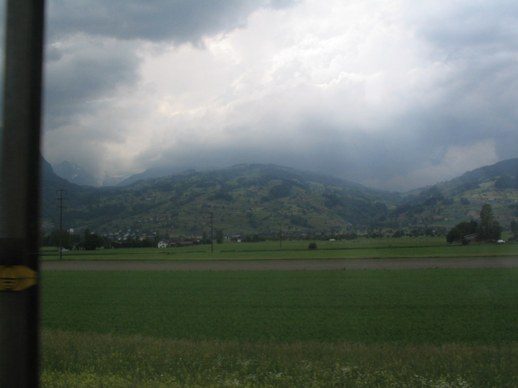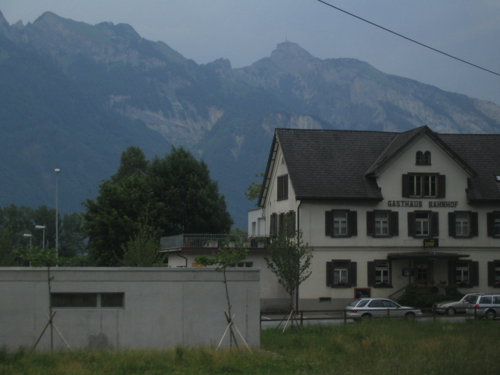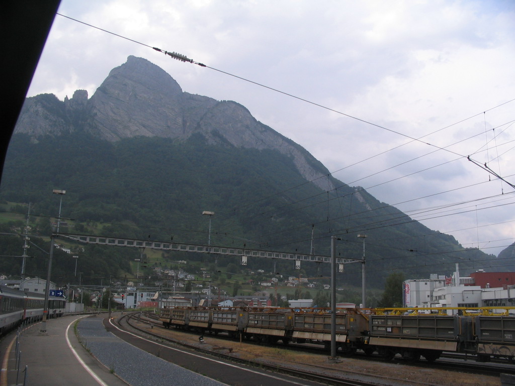 At Buchs, maybe, in which case through this storm of wires you can see Liechtenstein across the river. Liechtenstein seems to be about as tall (in elevation) as it is wide; you can basically see the whole country steeply tipped up toward you along this route. (I just checked and there's an approximately two-mile elevation difference from lowest point to highest there, while the country is about six miles wide. Not enormously far off, actually.)