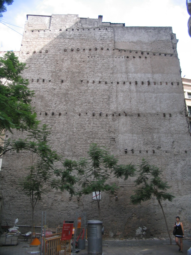 At the southeastern end of the Plaça de Victor Balaguer along Carrer de la Nau, an exposed party wall saturated with truncated floor beams.