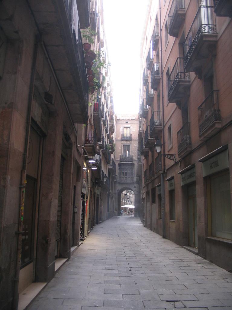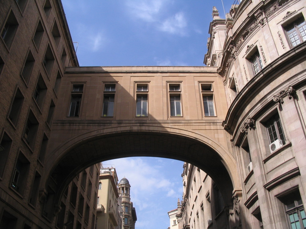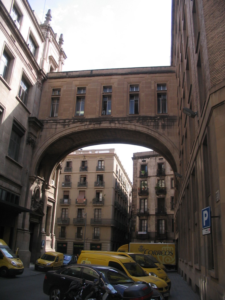 Yet another building bridge, a multistory one, particularly appealing with its bay window despite a somewhat dilapidated state. This is nearly the full extent of Carrer Nou de Zurbano, which crosses into the Plaça Reial under the bridge. The southwestern arcade of the Plaça can be seen beyond.