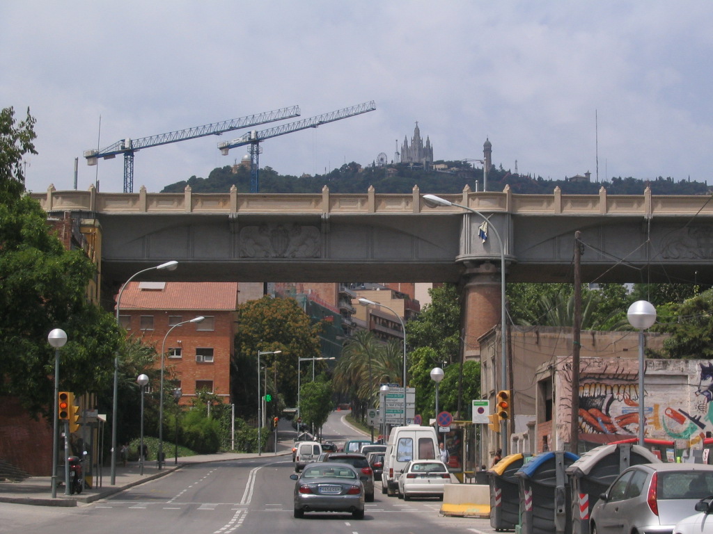 To get there, I rode the Metro to Passeig de Gràcia and thence to Vallcarca. Here, a striking view of Tibidabo up the Av. de Vallcarca, with the Carrer Viaducte de Vallcarca crossing overhead.
