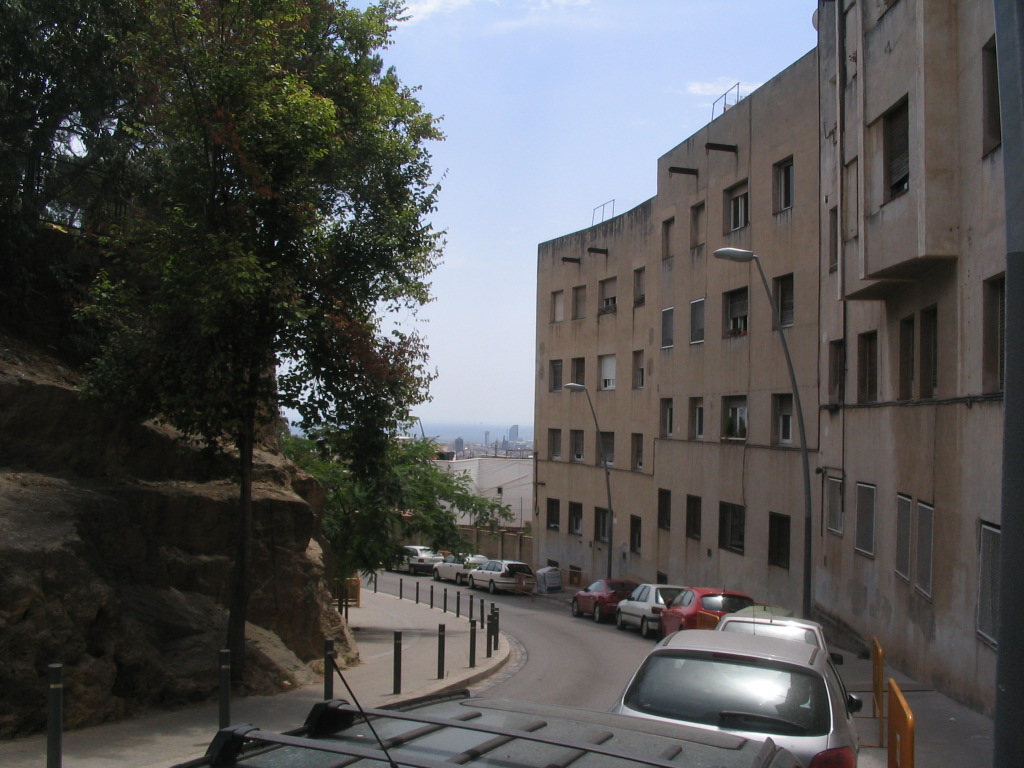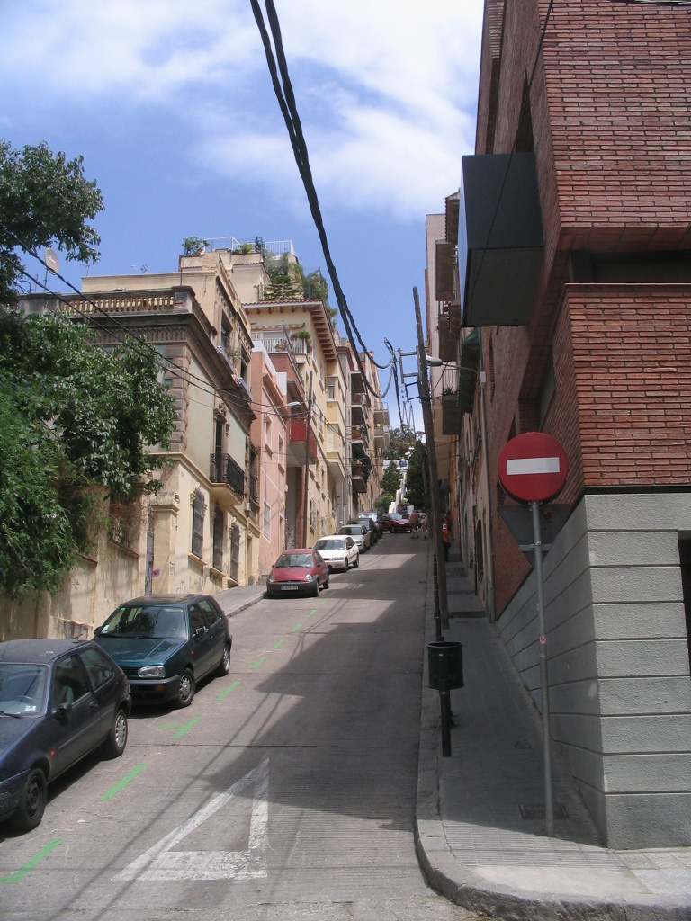 Right at the top of the Baixada is Park Güell itself. The Park's cliffs jut out at left, forcing the Av. Coll del Portell to bend around them here.