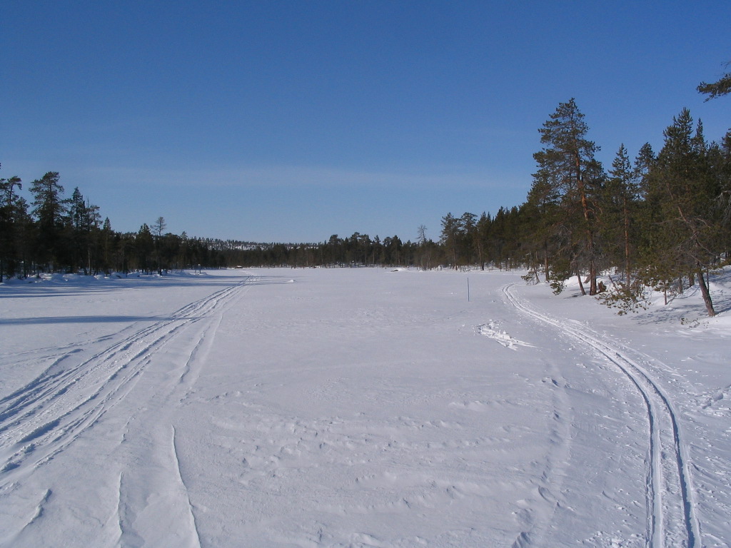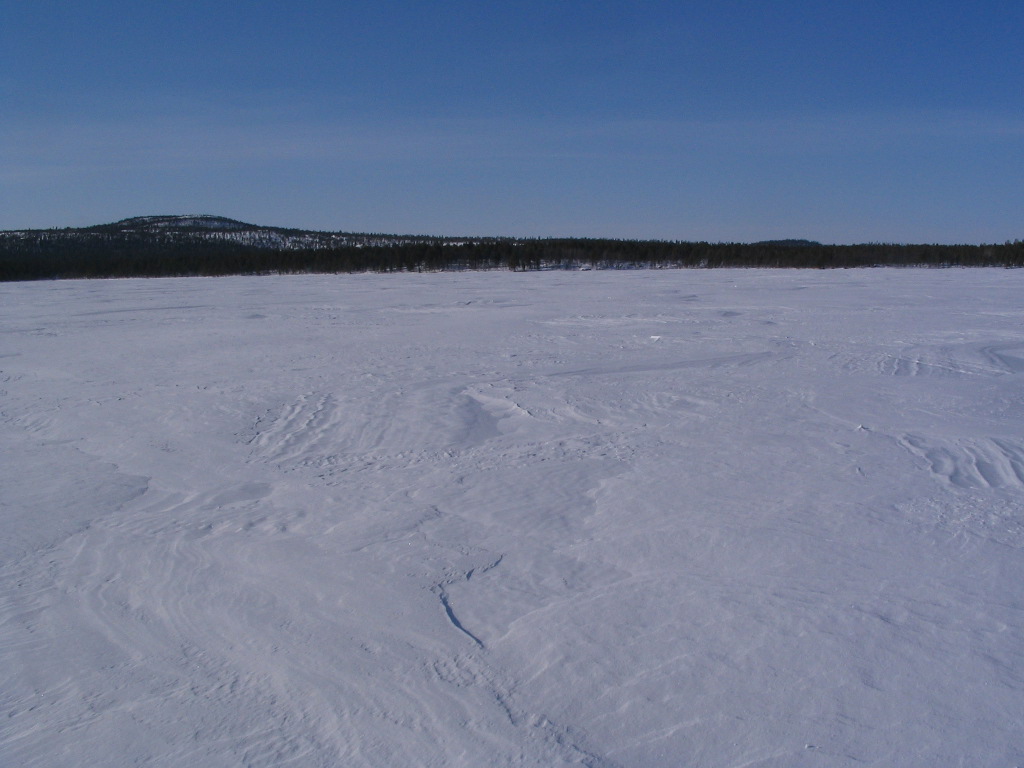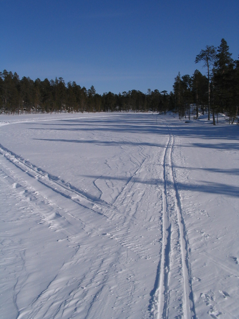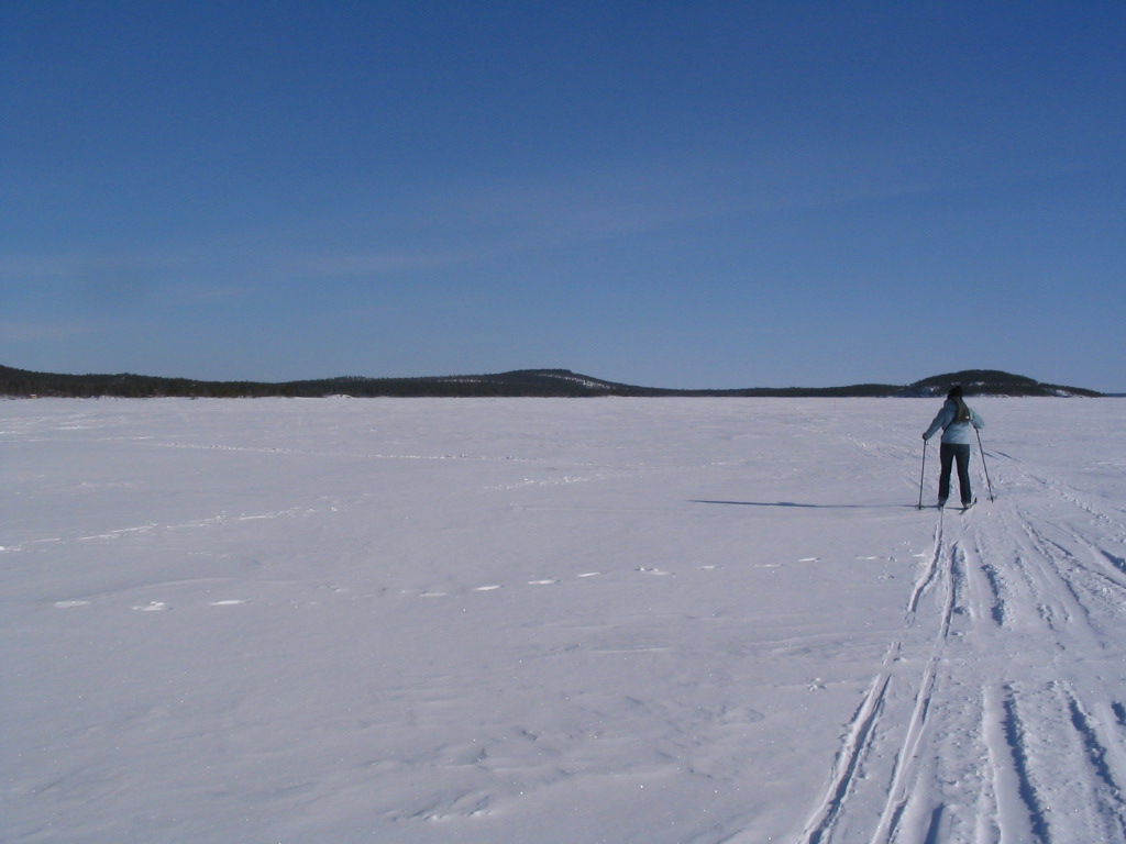 The first part of the ski route was on the frozen Inarijärvi (Inari Lake). Inarijärvi is very large; it extends maybe 40 miles northeast from Inari. We only saw a tiny bit of it, particularly because its coastline is very complex and it's dotted with islands.