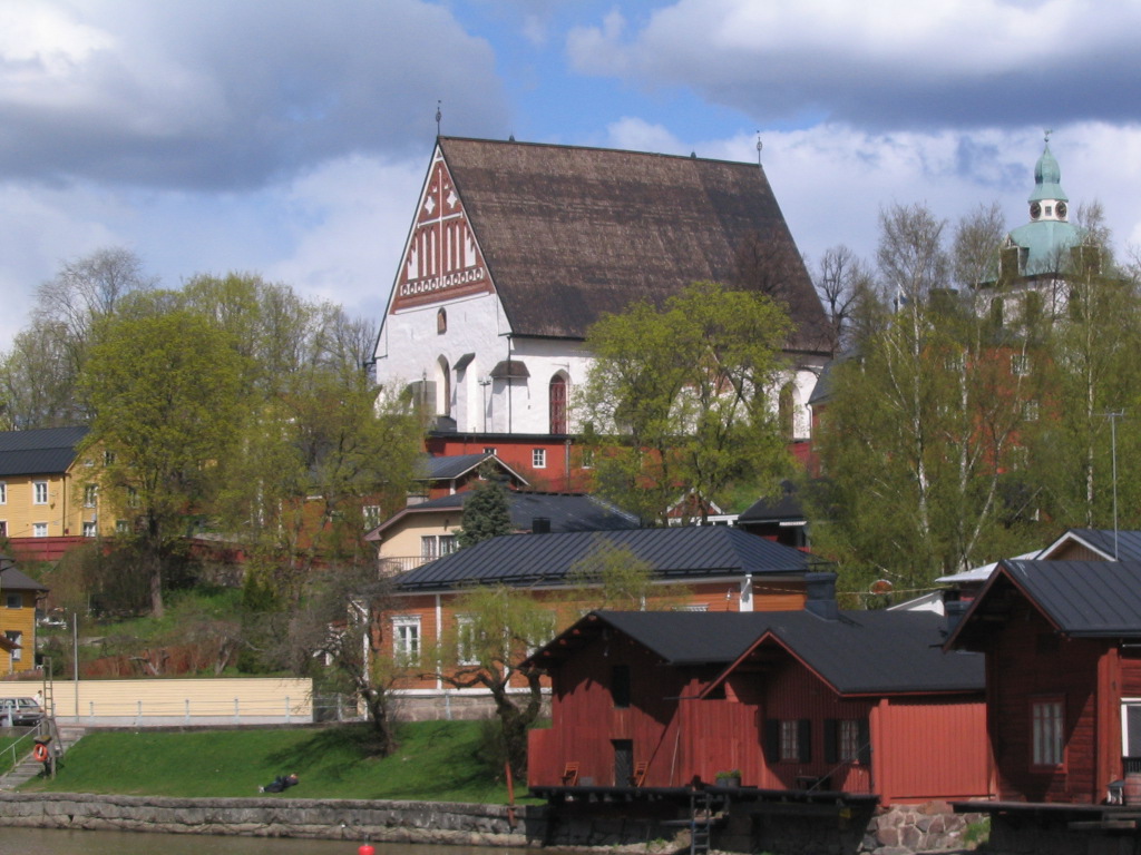 Upon arrival: a view of Porvoo's famous old red riverside storage buildings, with the medieval cathedral, built 13th–15th centuries (and its roof rebuilt after an arson in 2006) visible beyond.
