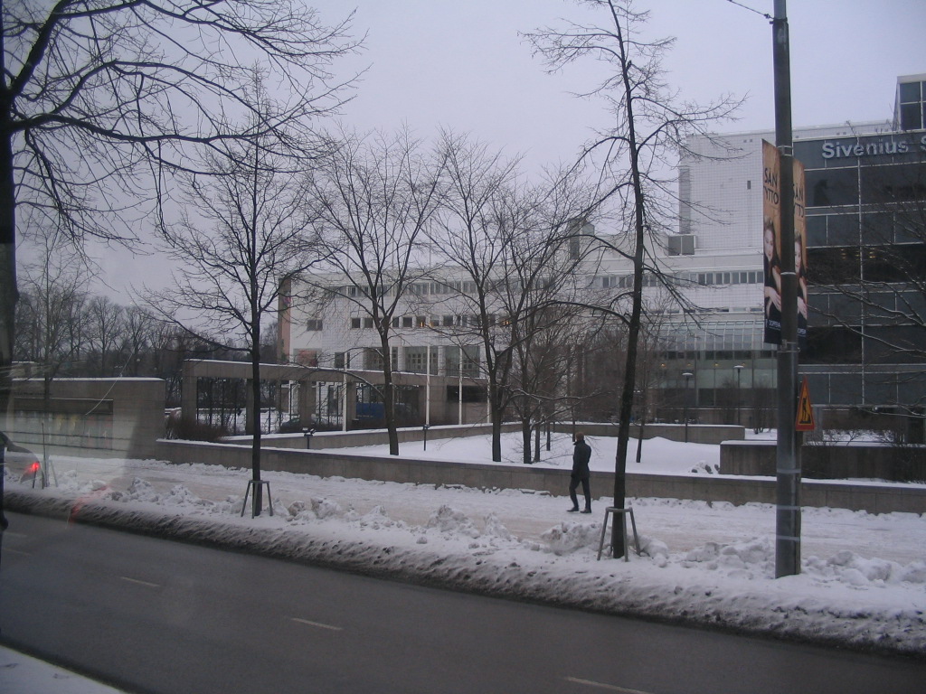 To start out, we rode a bus toward Turku, which is Finland's old capital city, at the southwest corner of the mainland. Here we are still in Helsinki, riding northwest on Mannerheimintie; the white building in the background is the Oopperatalo (Opera House).