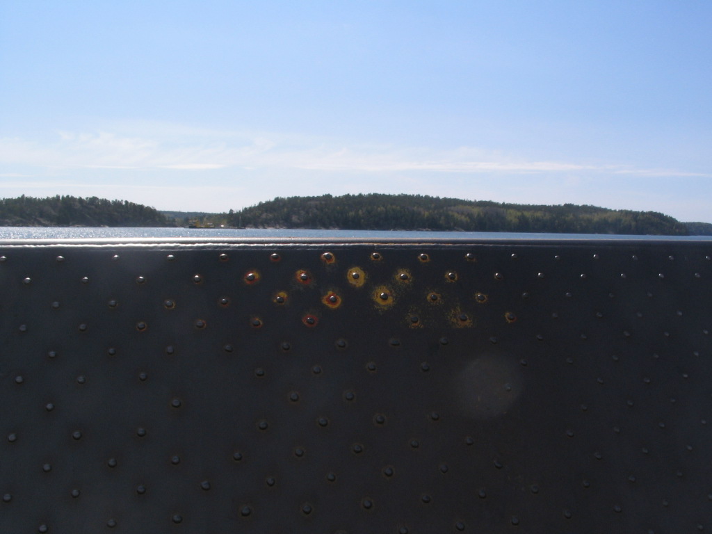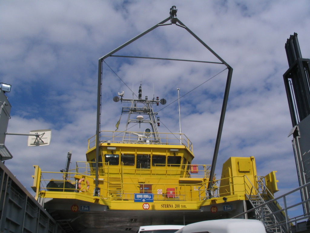 We were able to get off the bus and walk around on deck; getting in the way of the view here is the front part of the deck over which the departing vehicles drive, tipped up to contain them.