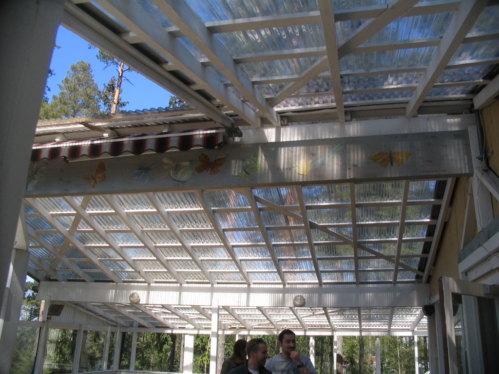 The expansive, daylight-friendly porch roof of the restaurant near the terminal.