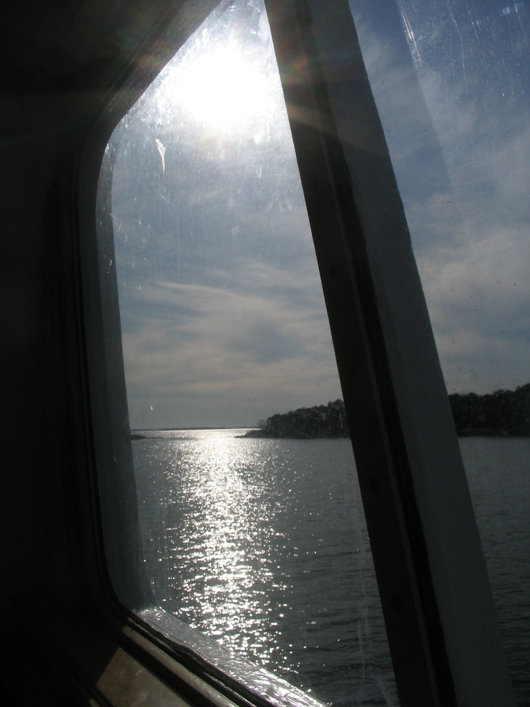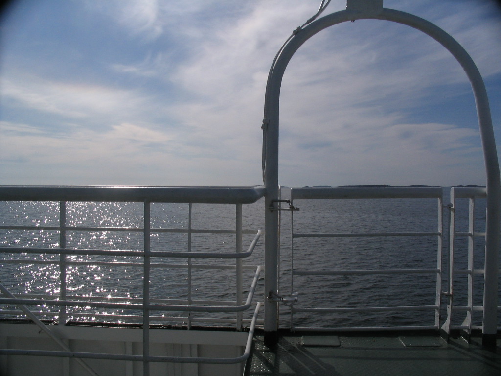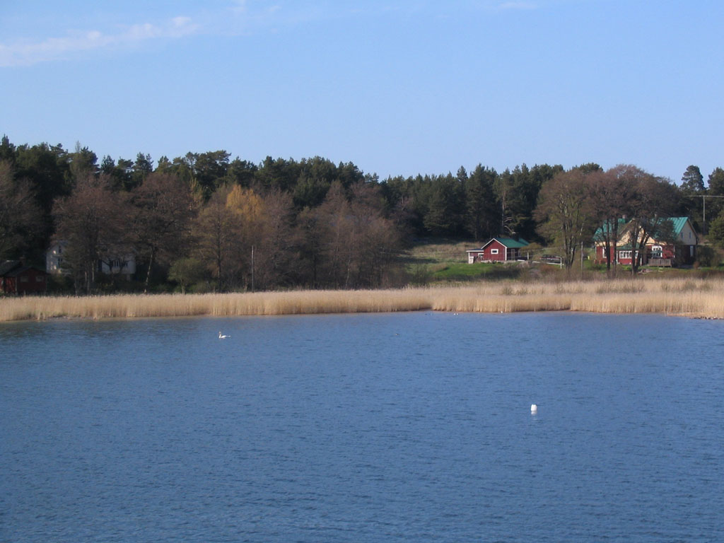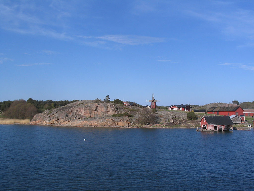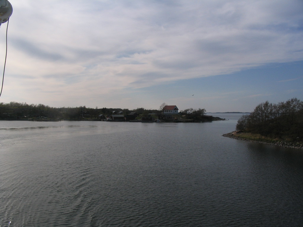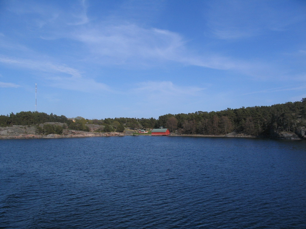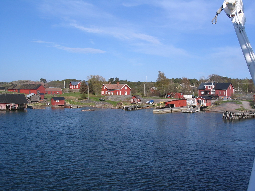 Receding from Aspö, its distinguishing church in view, with Sommarön to the right.