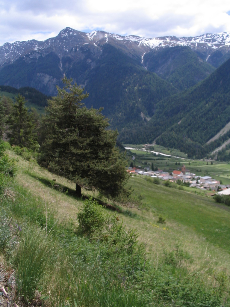 A more distant Ramosch and a larch keeping its branches a consistent distance off the ground, which, how do trees do that?