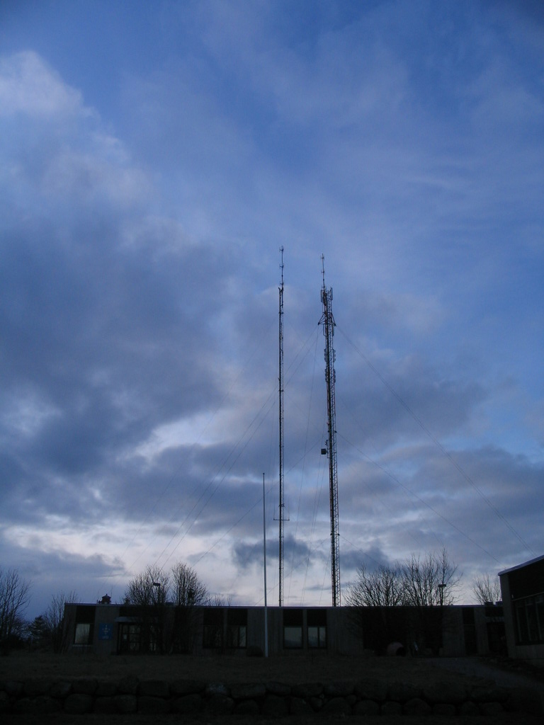 A wing of the main hotel, plus the tall radio towers just beyond it.