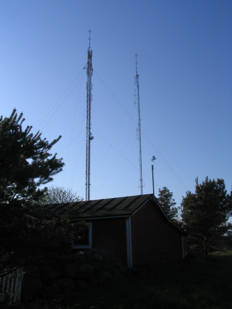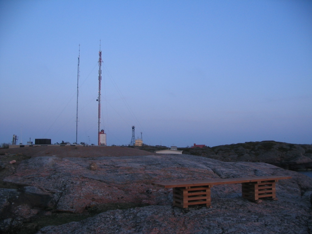 The back side of the bench sunset, the tiny lighthouse snuggled up against the radio tower.