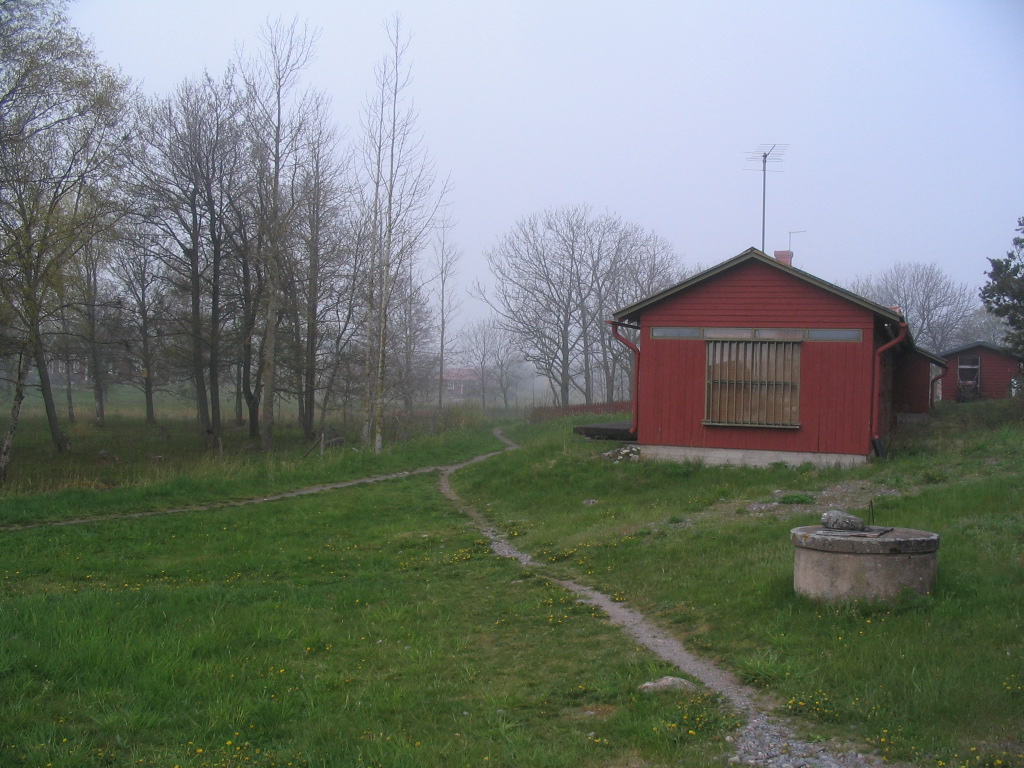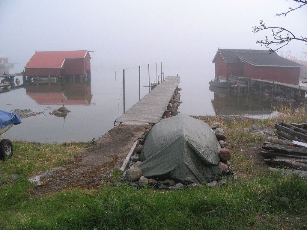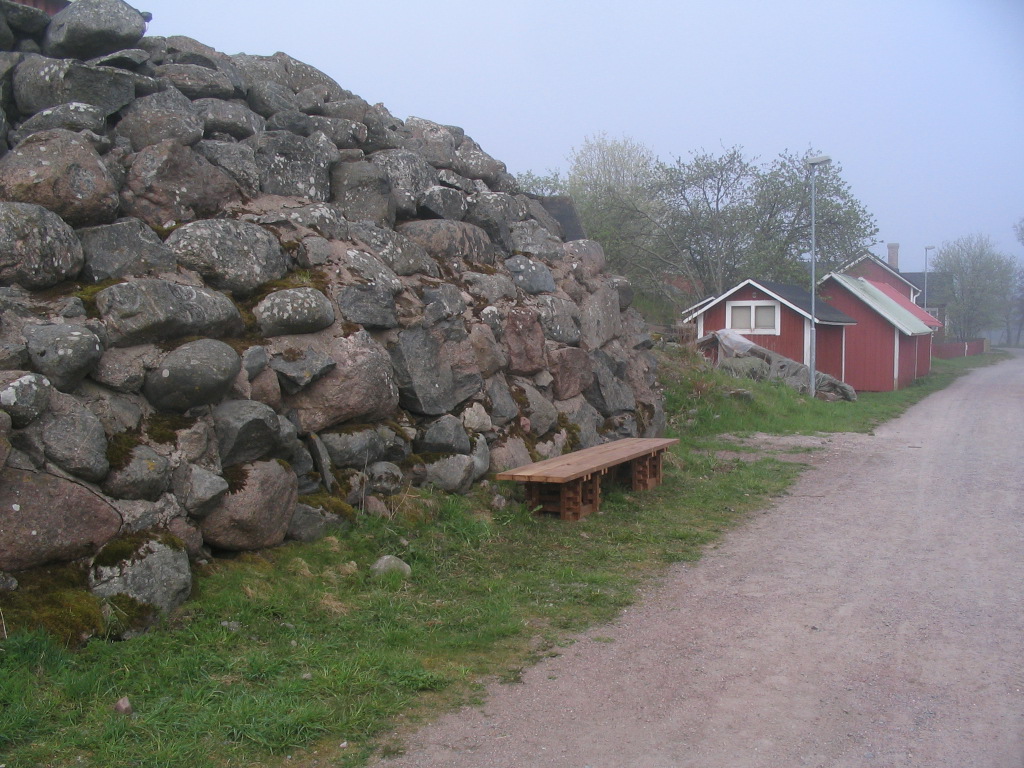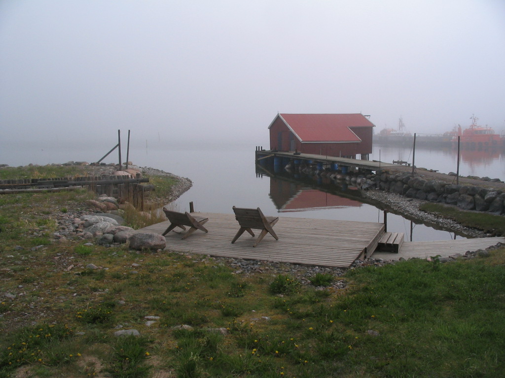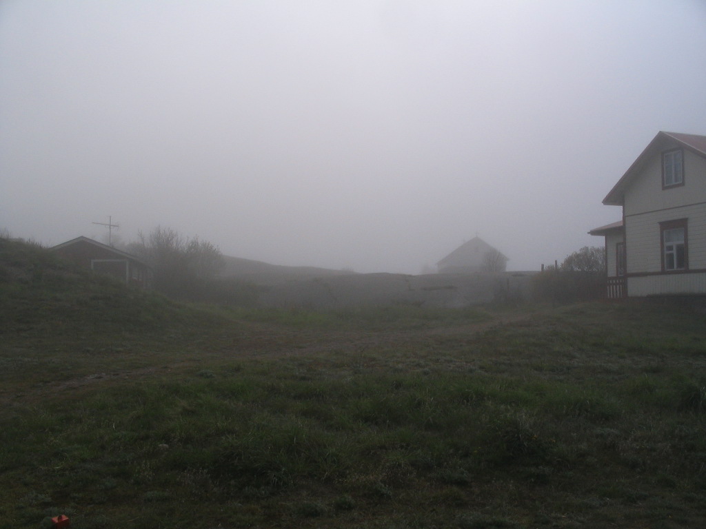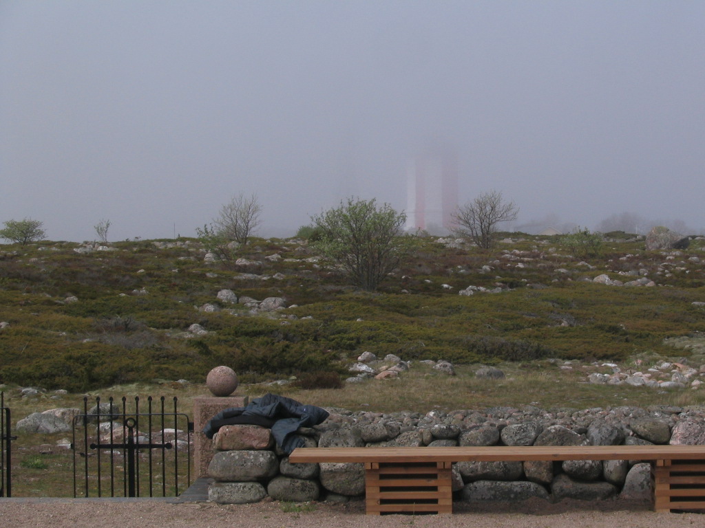 From the cemetery (with one of its new benches): the fog lifted off just enough to spy the lighthouse.