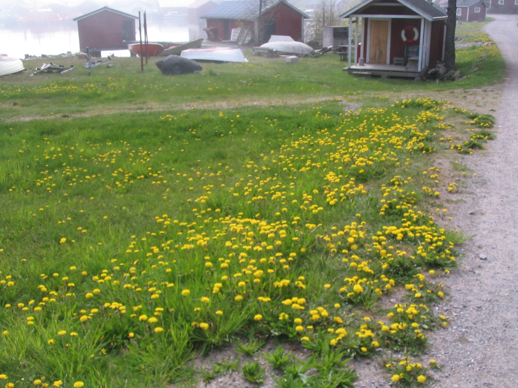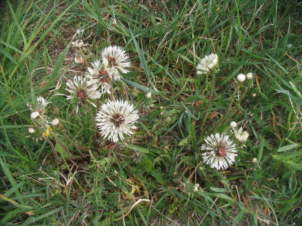 Dew-bedraggled dandelions, already done blooming by then. Covered in those vivid orange-and-black beetles!