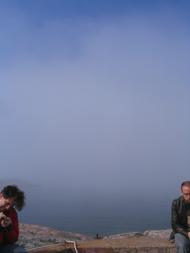 The ocean view between James and Brian, while we were all sitting around the edge of an empty turret.